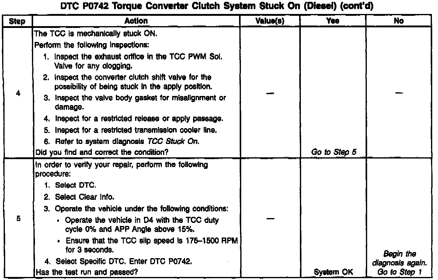 If the PCM detects low TCC slip when the TCC is commanded OFF, then DTC P0742 sets. DTC P0742 is a type B DTC.