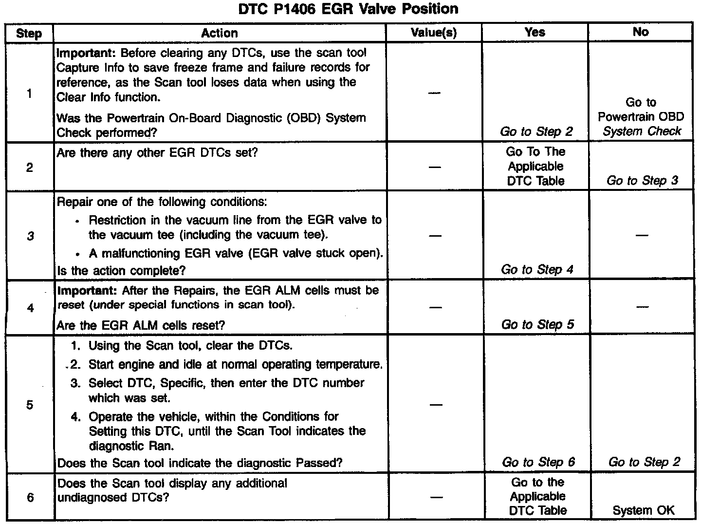 A vacuum leak will cause a DTC P1406. Carefully check all vacuum lines and components connected to the hoses for leaks or deformities. Check vacuum source to EGR solenoid assembly. Also check for small leak in EGR valve, and proper vacuum line routing. Vacuum line ends can be trimmed to ensure a tight fit if length permits.