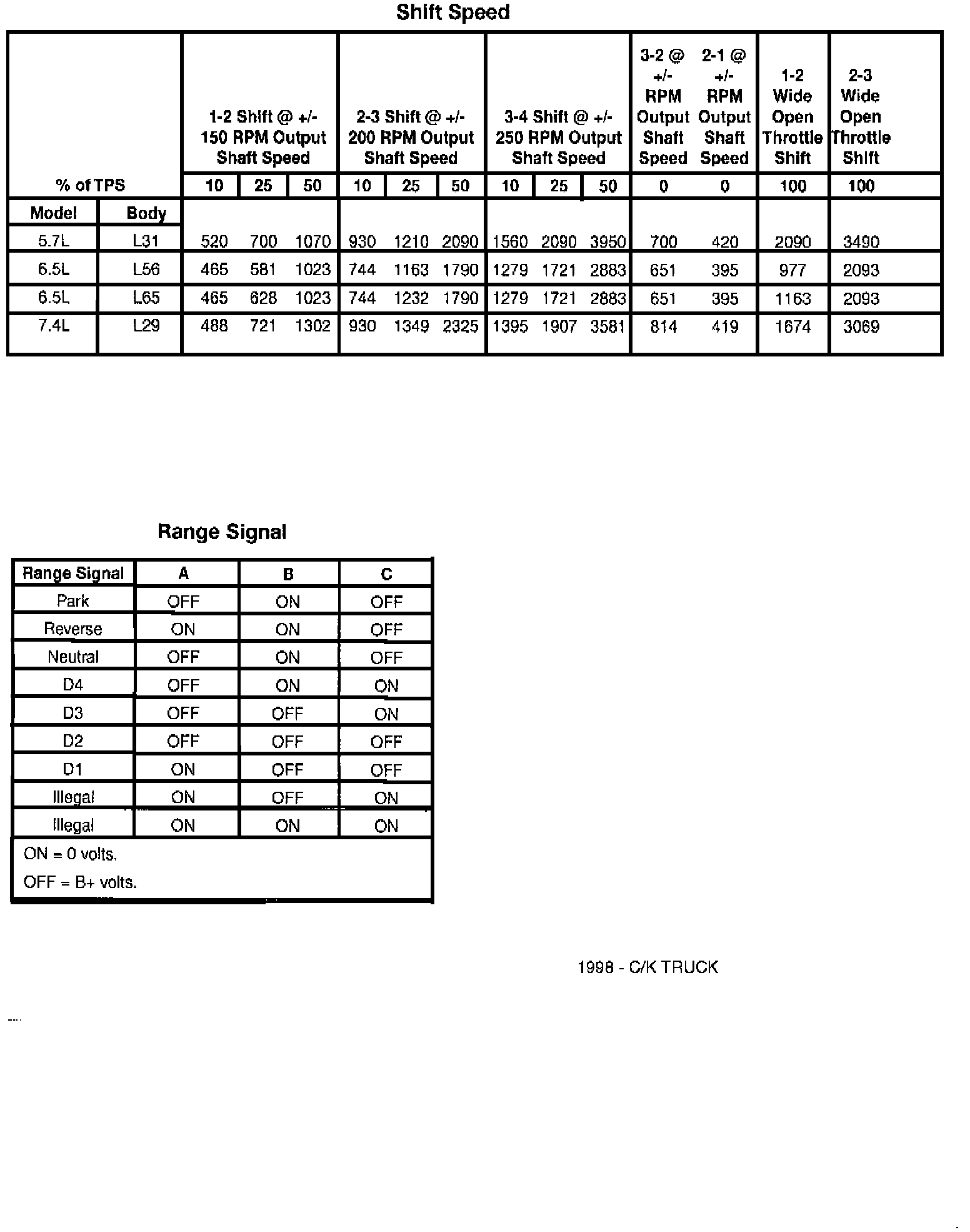 The shift speed chart and the range signal chart were omitted from the Service Manual. The 1-2 Shift solenoid valve state is corrected to indicate "ON" on the overdrive range fourth gear chart. Make a note of the listed changes in your Service Manual.