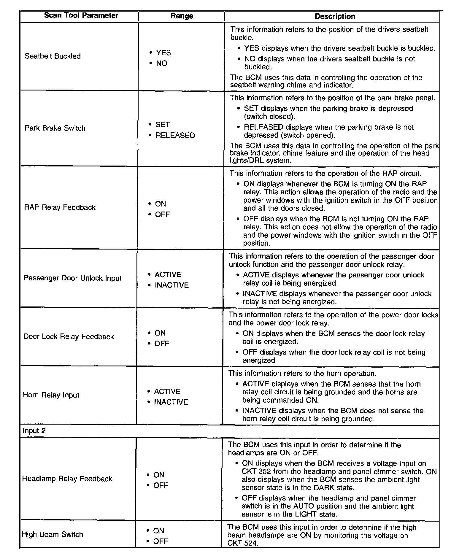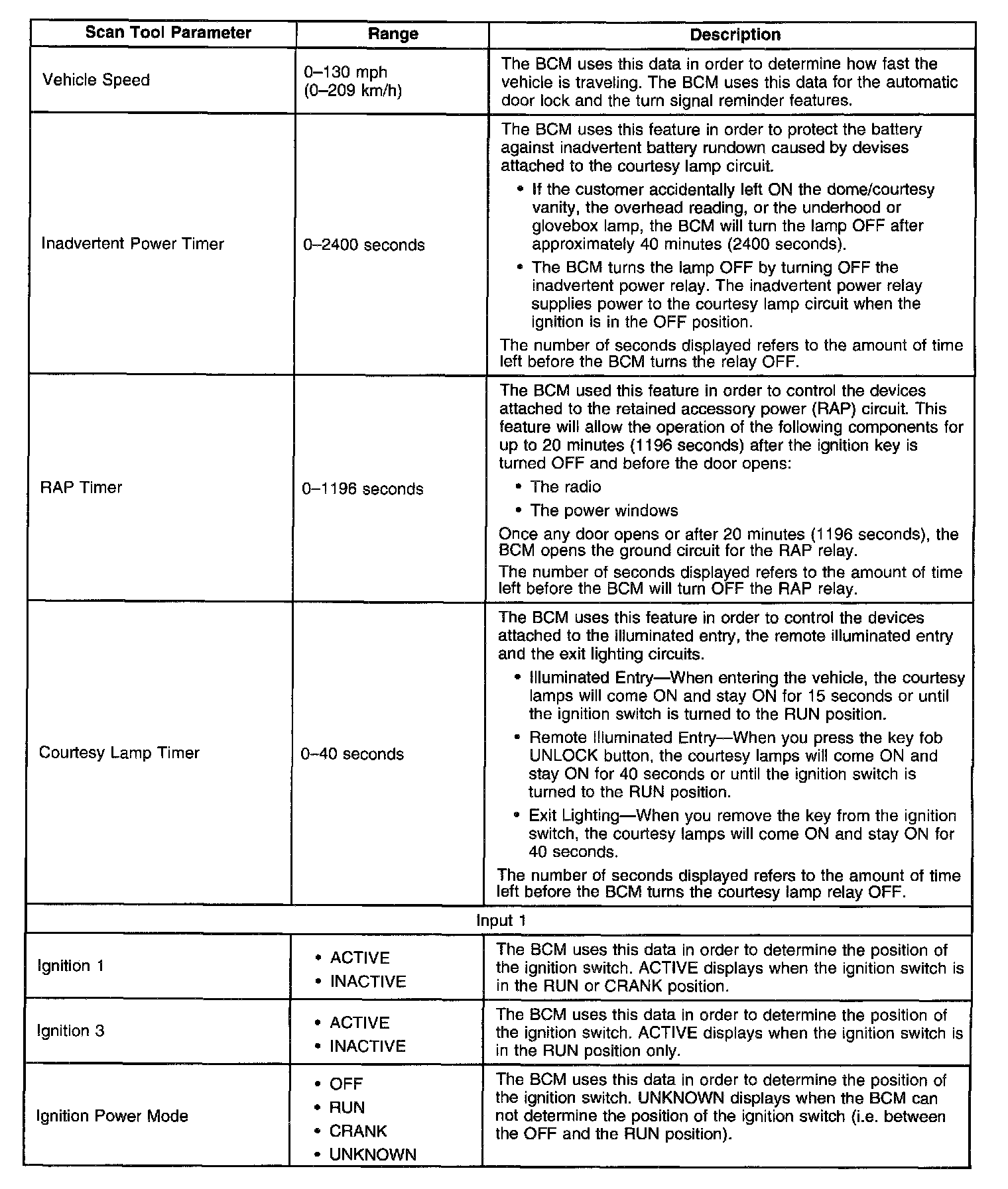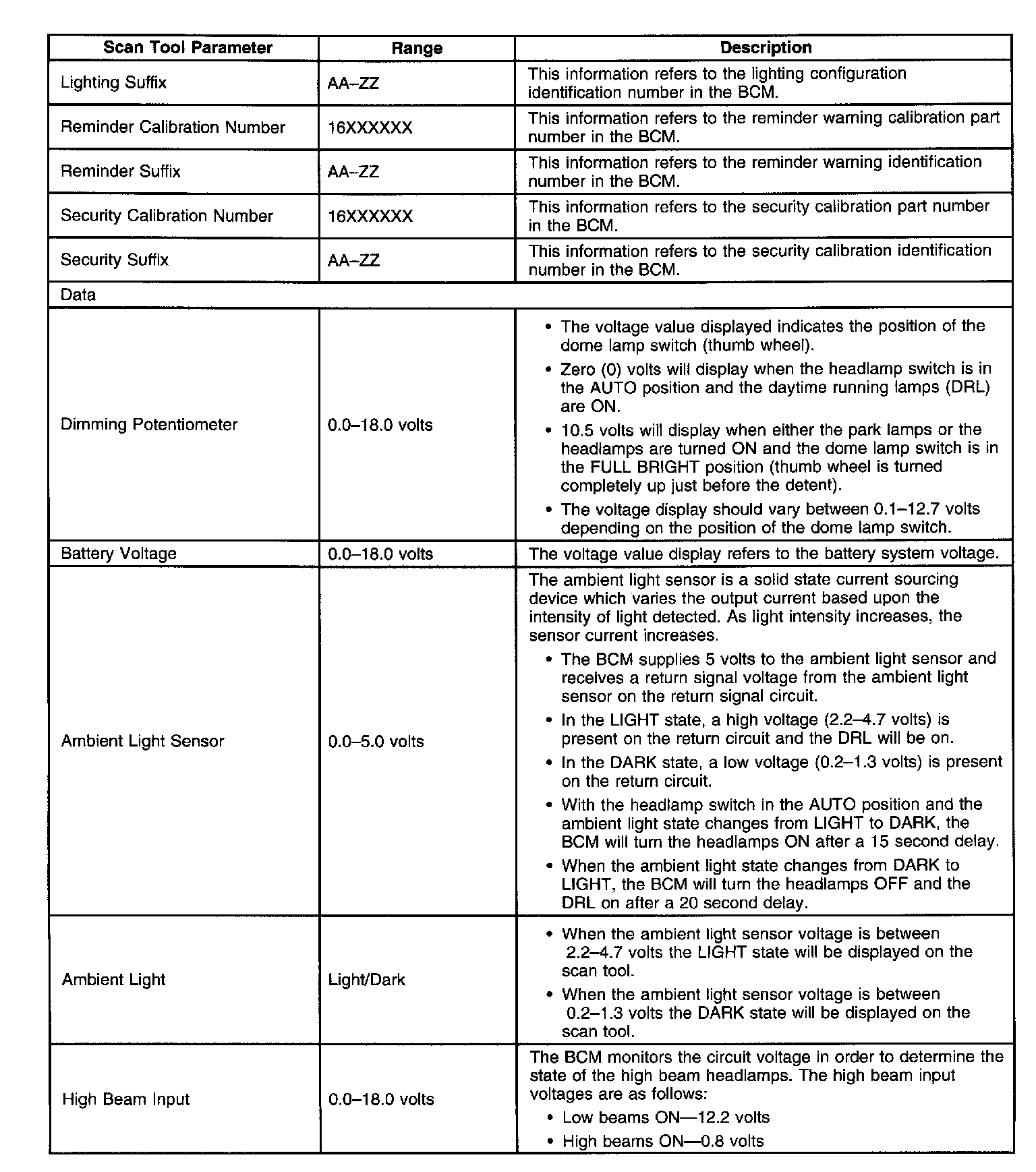 The typical scan tool readings of Body Control Module (BCM) data will assist in diagnosing a problem. You can view the reading while the vehicle is being driven. The Typical Scan Tool Data Definitions represent general information displayed on the scan tool regarding, BCM functions, ignition inputs, and basic operating conditions. The data messages and menu headings displayed on the scan tool are as shown in figures.