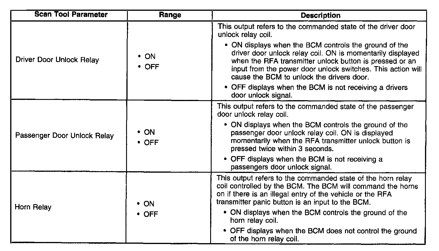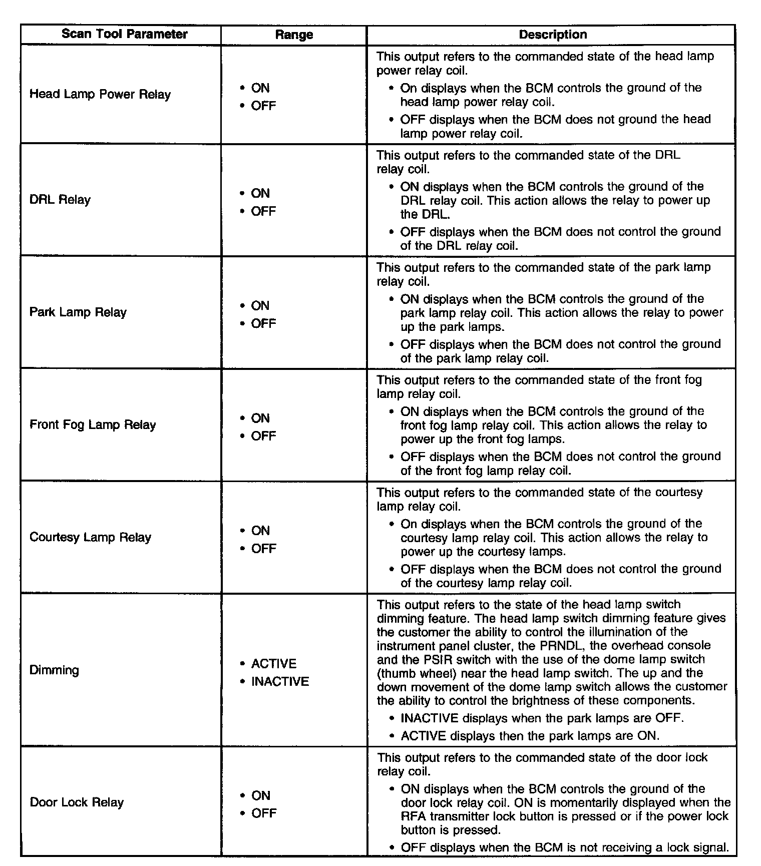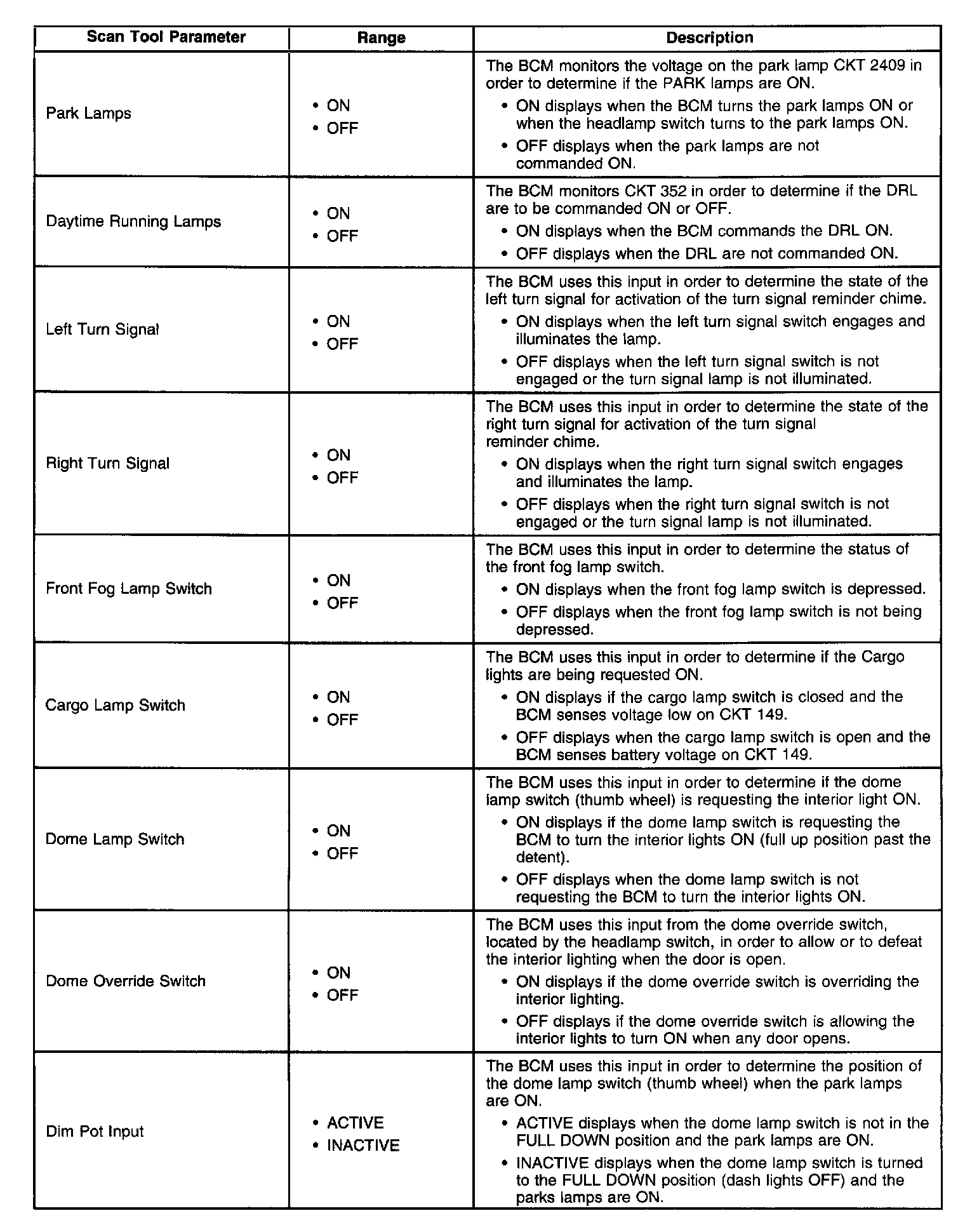 The typical scan tool readings of Body Control Module (BCM) data will assist in diagnosing a problem. You can view the reading while the vehicle is being driven. The Typical Scan Tool Data Definitions represent general information displayed on the scan tool regarding, BCM functions, ignition inputs, and basic operating conditions. The data messages and menu headings displayed on the scan tool are as shown in figures.