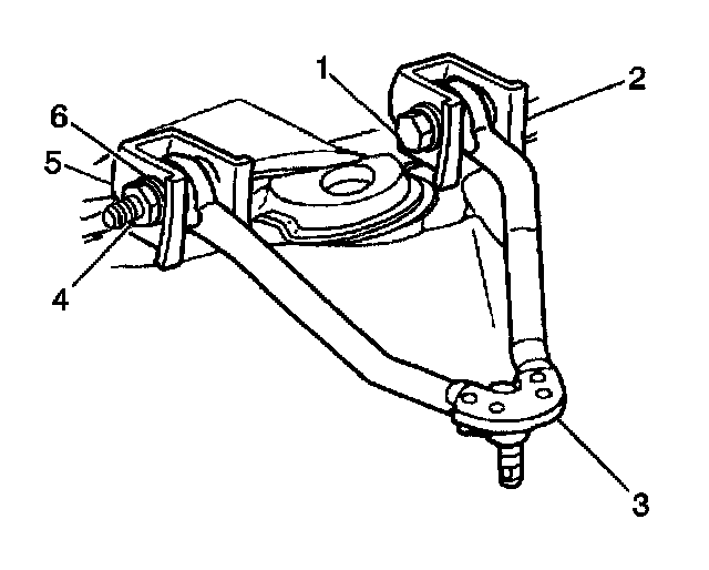 1. Install the upper control arm (3) into the frame brackets (2).