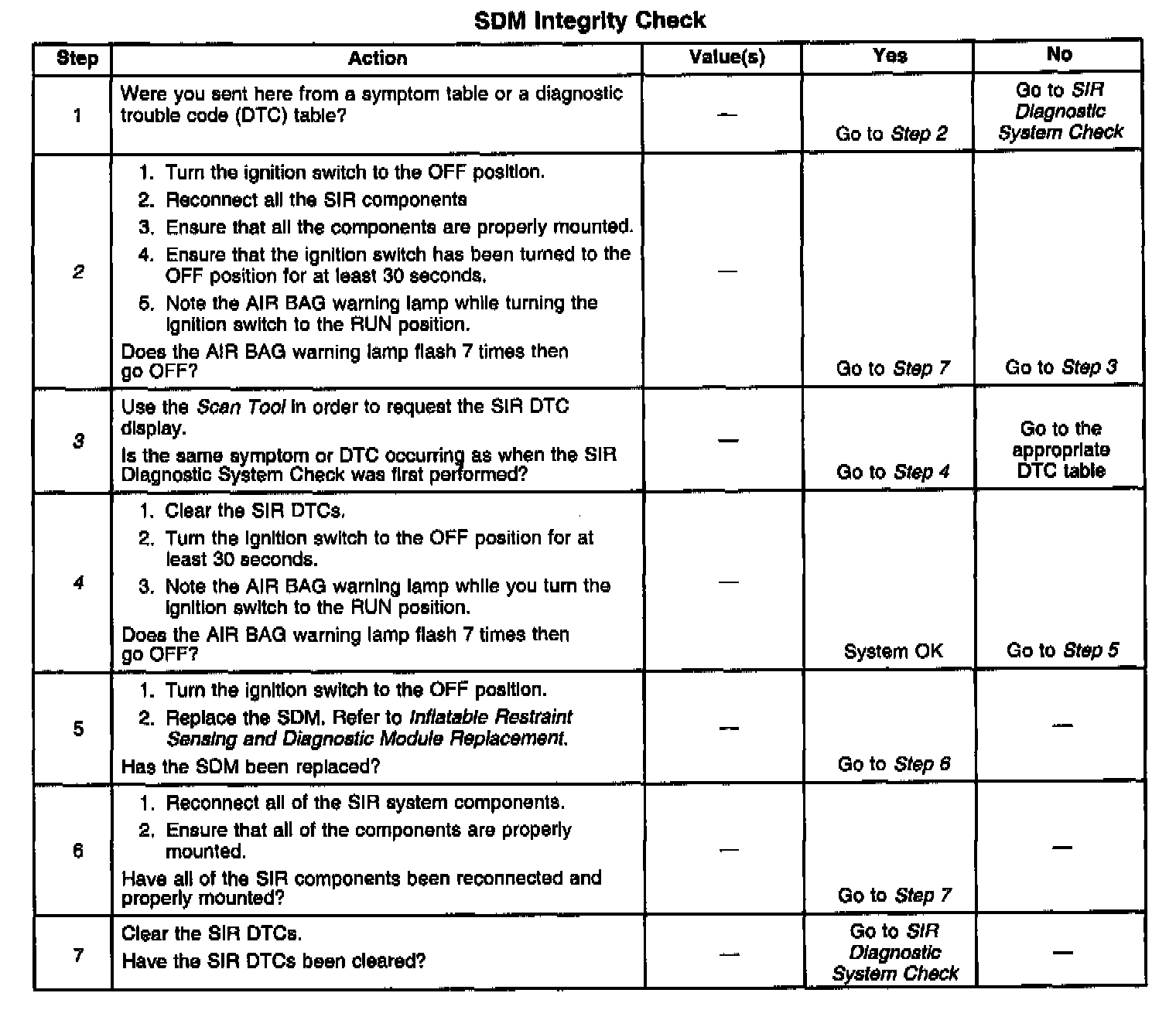 This table assumes that the SIR Diagnostic System Check or a diagnostic trouble code table diagnosis has been performed. When all circuitry outside the Inflatable Restraint Sensing and Diagnostic Module (SDM) has been found to operate properly, as indicated by the appropriate diagnostic table, and the symptom or DTC remains current, the following diagnostic procedures must be performed in order to verify the need for SDM replacement.