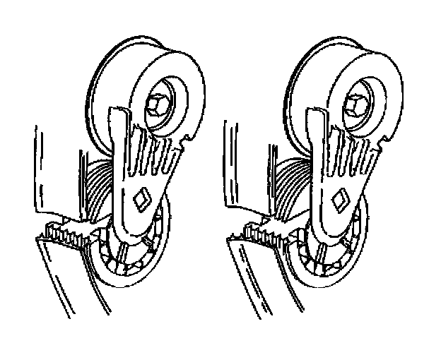 9. Confirm for the proper drive belt size and the correct drive belt routing by observing the location of the fix pointer and the index marks on the drive belt tensioner. With a new drive belt installed, the fix pointer should align within the indentation on the drive belt tensioner.