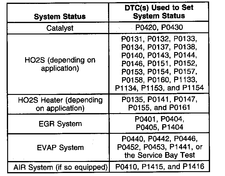 Using a scan tool, the technician can observe the System Status (Complete or Not Complete) in order to verify that the vehicle meets the criteria which complies with the local area requirements. Using the System Status display, monitor any of the following systems or a combination of the systems (depending on vehicle make and model) for I/M Readiness: