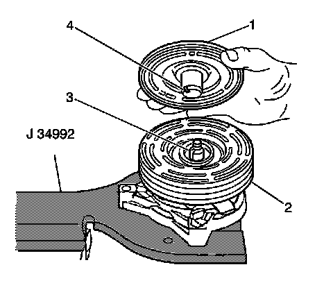 5. Place the clutch plate and the hub assembly (1) onto the compressor shaft.
