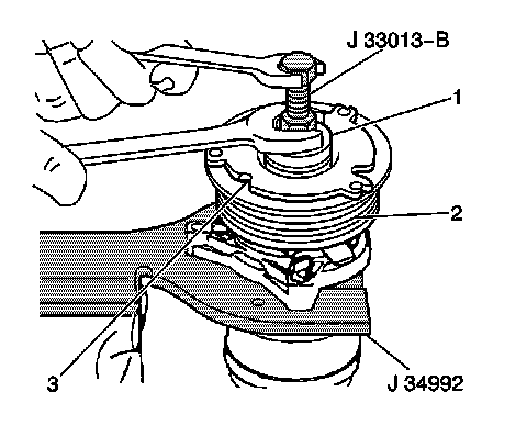 9. Back off the body of the J 33013-B as necessary in order to permit the center screw to be threaded onto the end of the compressor shaft.
