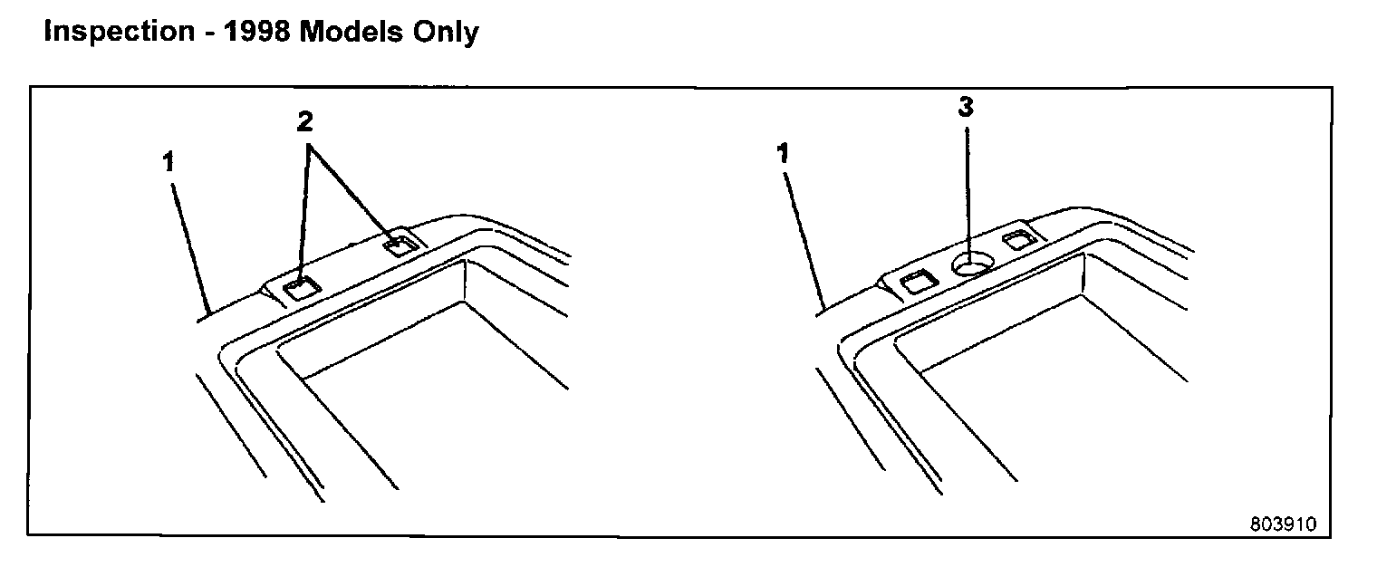 ImportantSome early production 1998 vehicles were manufactured with an upper console plate (1) that does not have a round or D-shaped hole (3) located between the two square holes (2). In order to perform this campaign the vehicle MUST HAVE this additional hole (3) in the upper console plate.