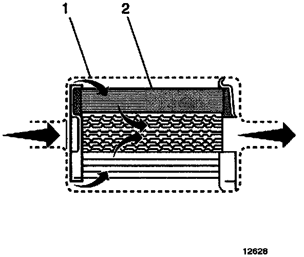 The fuel filter is located on the fuel feed pipe, between the fuel pump and the fuel injectors. The paper filter element (2) traps particles in the fuel that may damage the fuel injection system. The filter housing (1) is made to withstand maximum fuel system pressure, exposure to fuel additives, and changes in temperature. There is no service interval for fuel filter replacement. Replace a restricted fuel filter.