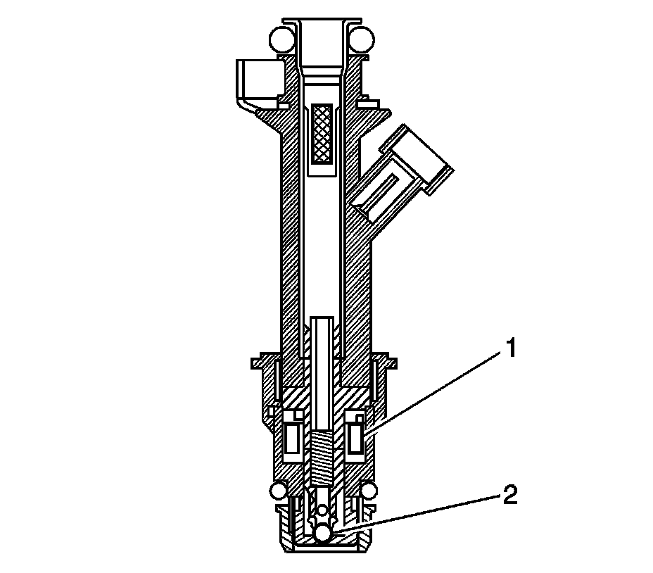 The Multec 2 fuel injector assembly is a solenoid device, controlled by the PCM, that meters pressurized fuel to a single engine cylinder. The PCM energizes the high-impedance (12.0 ohms) injector solenoid (2) to open a normally closed ball valve (3). This allows fuel to flow into the top of the injector, past the ball valve, and through a director plate at the injector outlet. The director plate has two machined holes that control the fuel flow, generating a spray of finely atomized fuel at the injector tip. Fuel from the injector tip is directed at the intake valve, causing it to become further atomized and vaporized before entering the combustion chamber. This fine atomization improves fuel economy and emissions.