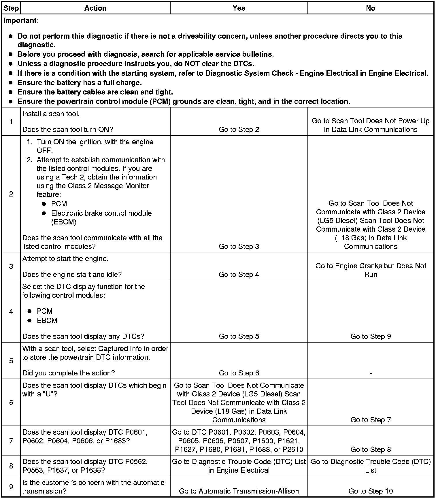 The Diagnostic System Check-Engine Controls is an organized approach to identifying a condition that is created by a malfunction in the engine control system. The Diagnostic System Check must be the starting point for any driveability concern. The Diagnostic System Check directs the service technician to the next logical step in order to diagnose the concern. Understanding and correctly using the diagnostic table reduces diagnostic time and prevents the replacement of good parts.
