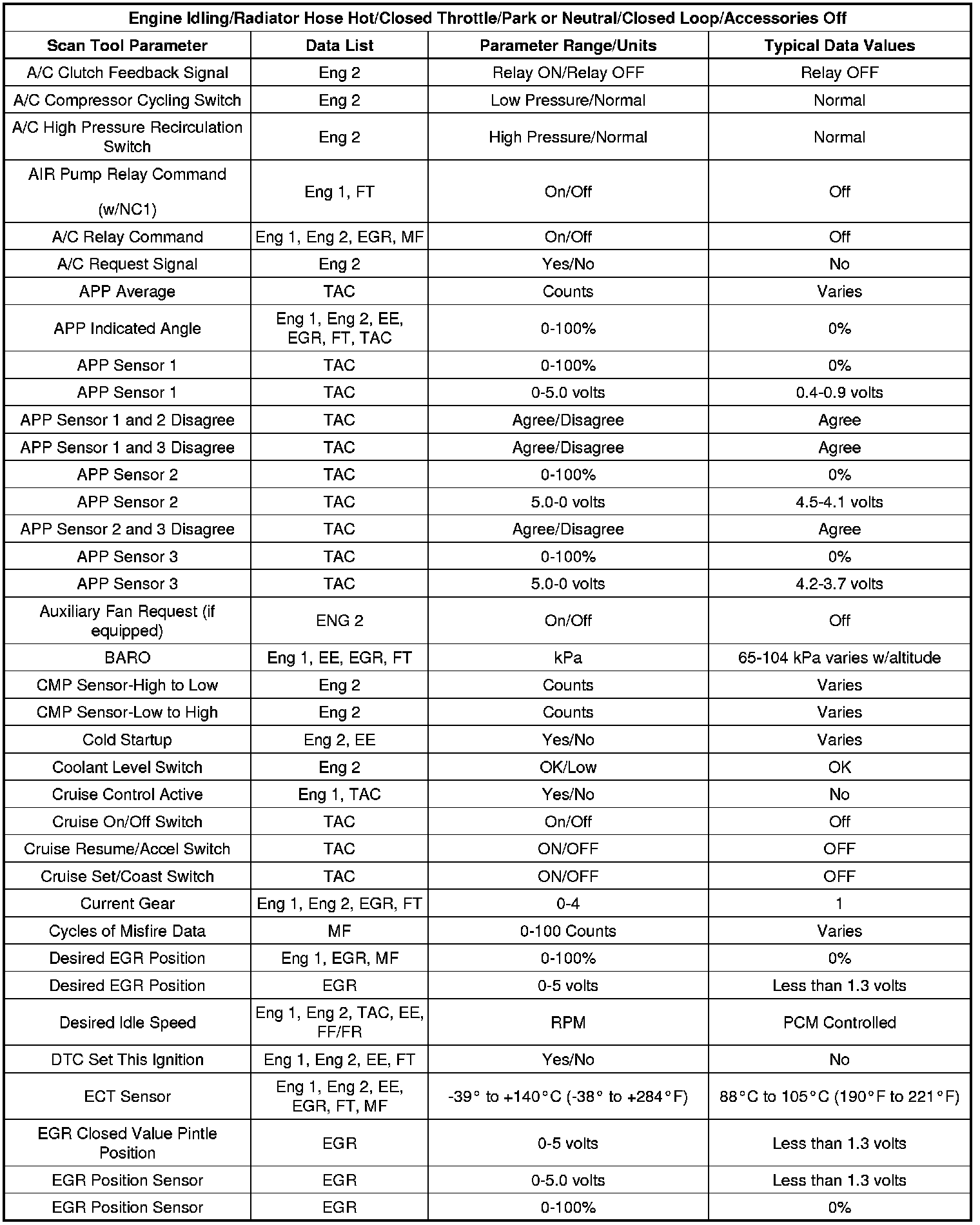The Engine Scan Tool Data List contains all engine related parameters that are available on the scan tool. The list is arranged in alphabetical order. A given parameter may appear in any one of the data lists, and in some cases may appear more than once, or in more than one data list in order to group certain related parameters together.