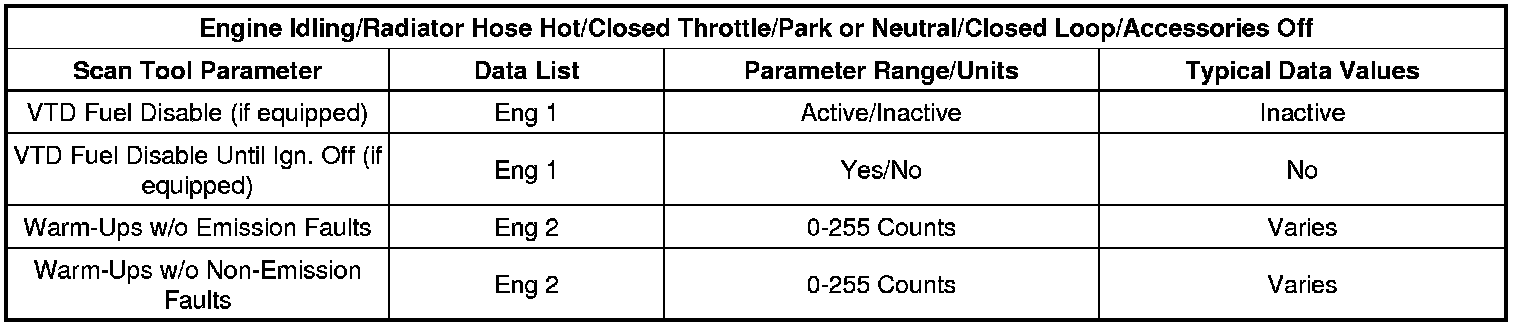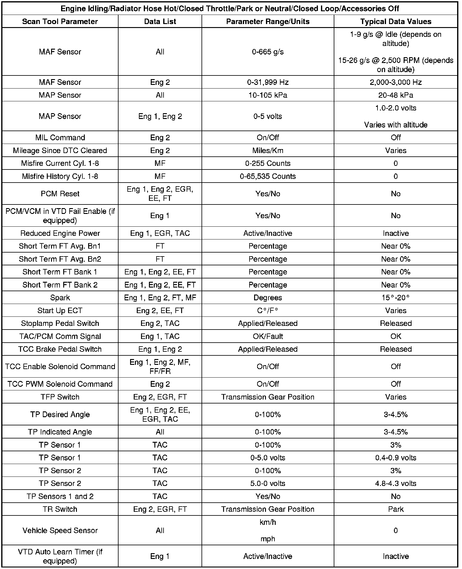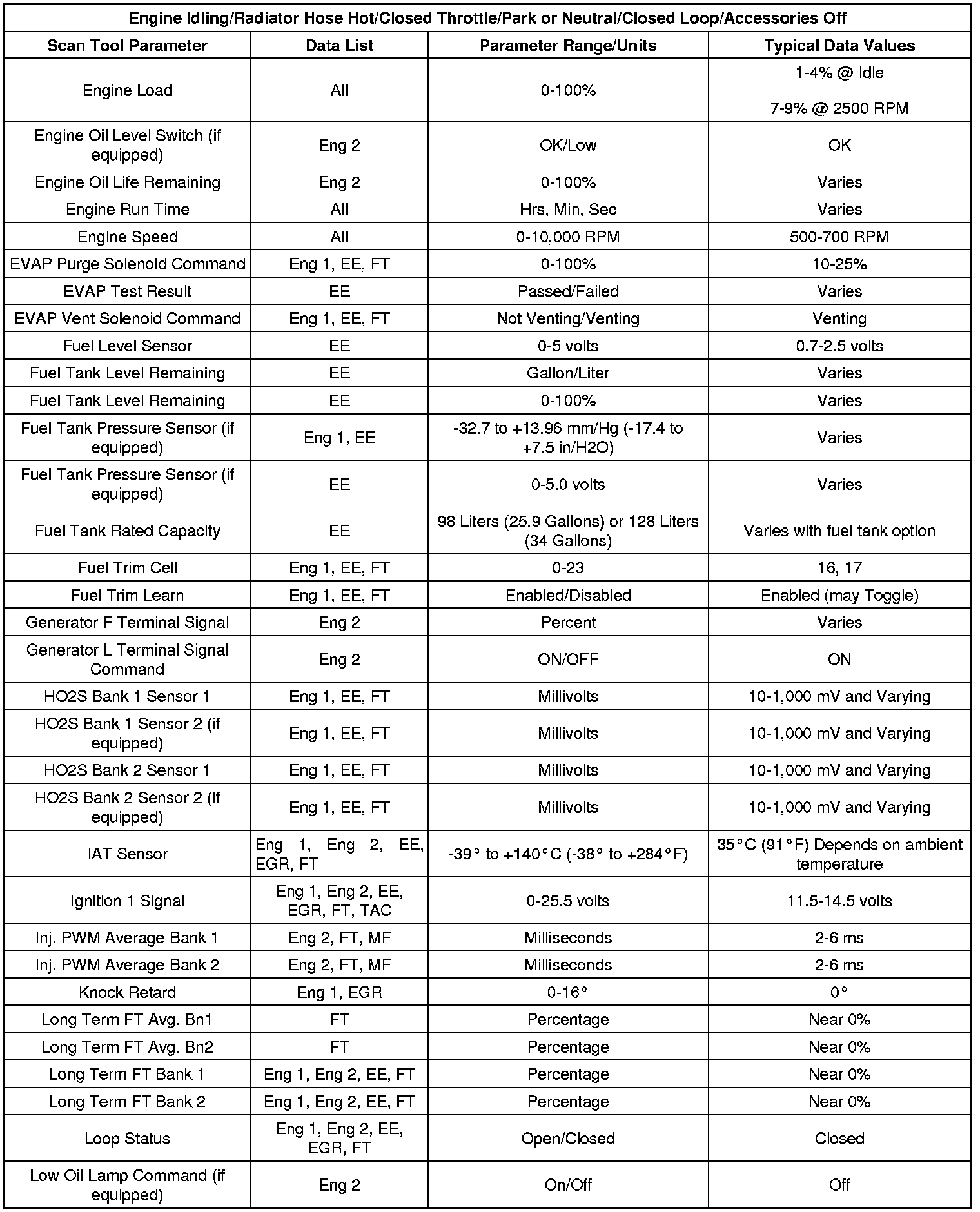 Scan tool values from a properly running engine may be used for comparison with the engine you are diagnosing. The Engine Scan Tool Data List represents values that would be seen on a normal running engine.