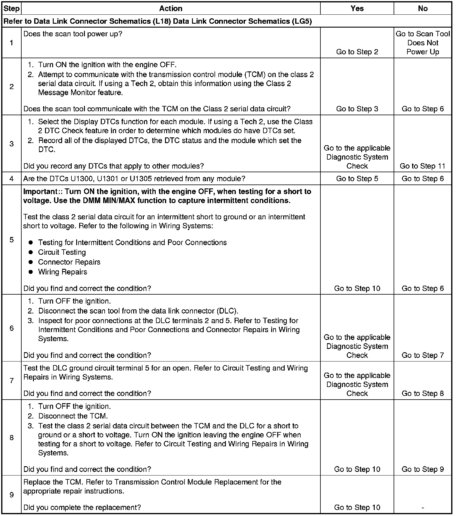 2. A partial malfunction in the class 2 serial data circuit uses a different procedure from a total malfunction of the class 2 serial data circuit. The (Allison) transmission control module communicates on the class 2 serial data circuit.