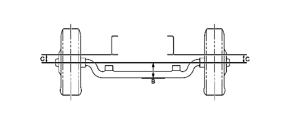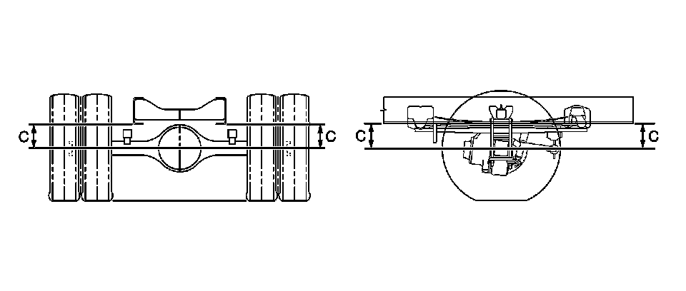 The tandem axle must be measured in three locations to be sure of proper ride height. B, C, E height dimension measurements determine the proper rear end ride height. There is no adjustment procedure. Repair may require replacement of suspension components.