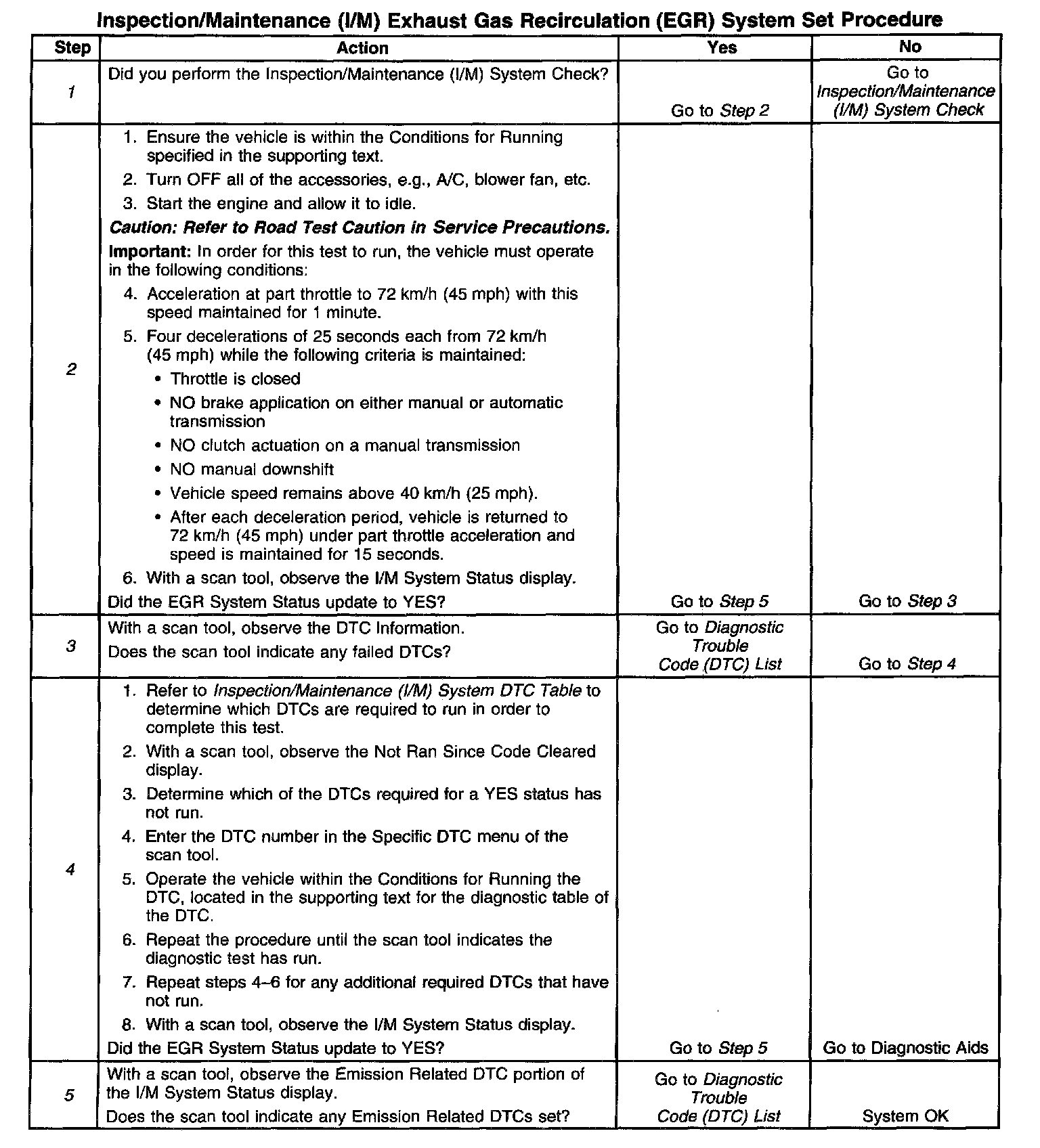 The control module only runs the EGR Active Tests during a gradual deceleration with a closed throttle and a vehicle speed above 40 km/h (25 mph). Several deceleration cycles may be necessary in order to accumulate a sufficient number of EGR flow samples. The procedure outlined in the table is for a clear, flat road. If the procedure is performed on a road with a slight down hill grade, the test may acquire the necessary sample counters in one or two decel trips. If the test is interrupted during the procedure, it may take more than three deceleration cycles to complete the test. If the status does not update, the test outlined in this procedure can be repeated until the I/M System Status updates to YES.