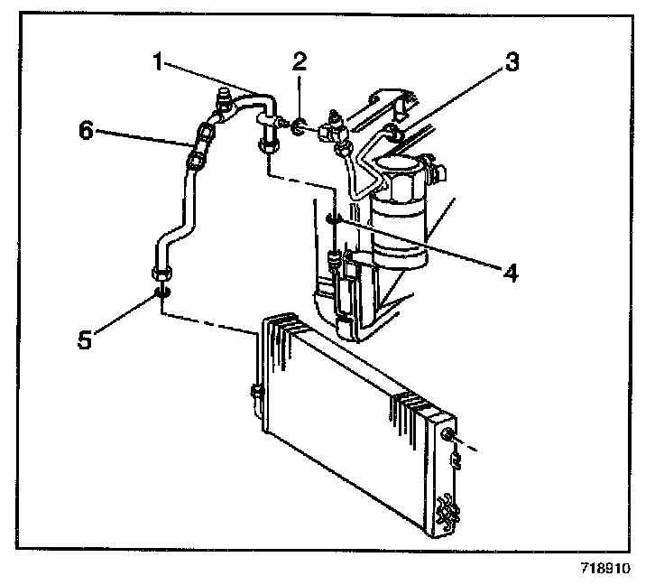 3. Install the A/C refrigerant filter (6) to the evaporator tube (1) with the flow arrow pointing towards the evaporator.