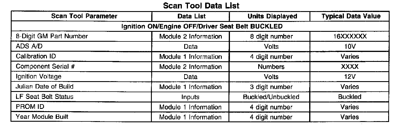 The SIR Scan Tool Data List contains all restraint system related parameters that are available en the scan tool. The parameters in the list are arranged in alphabetical order. The column "Data List," indicates the location of the parameter within the scan tool menu selections.