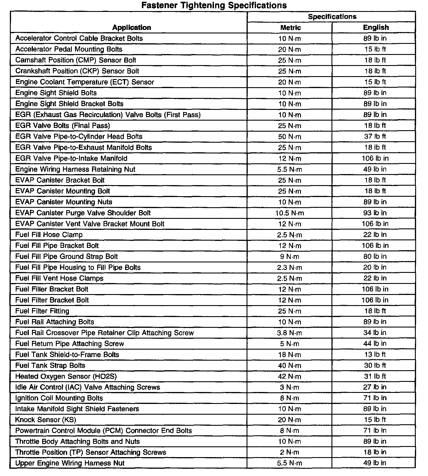 Fastener Tightening Specifications: