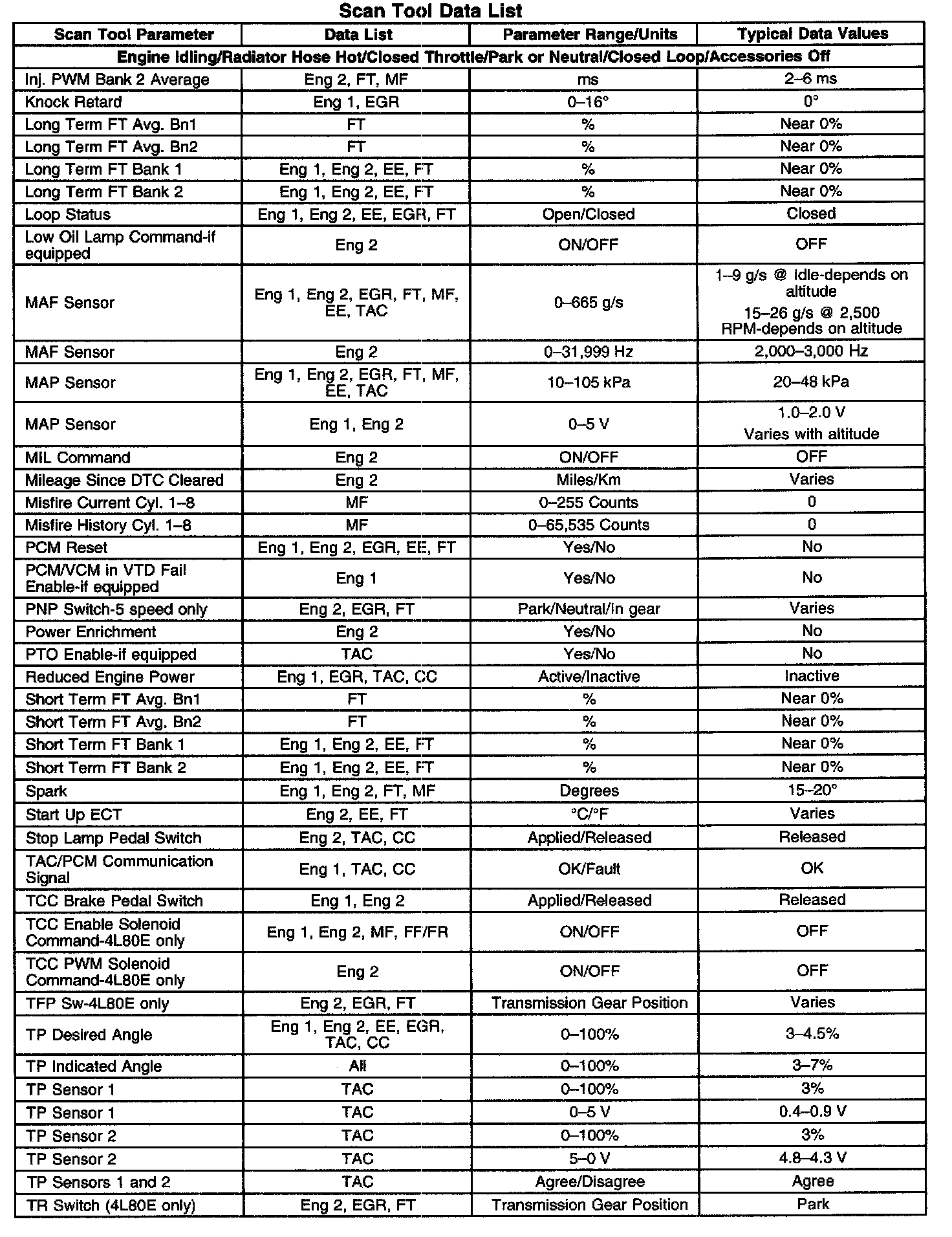 The Engine Scan Tool Data List contains all engine related parameters that are available on the scan tool. The list is arranged in alphabetical order. A given parameter may appear in any one of the data lists, and in some cases may appear more than once, or in more than one data list in order to group certain related parameters together.