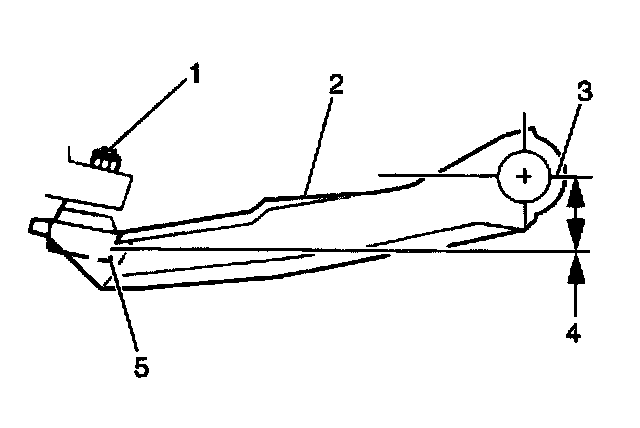 3. Measure from the pivot bolt center line (3) down to the lower corner (5) of the lower ball joint (1) in order to obtain the Z height measurement (4).