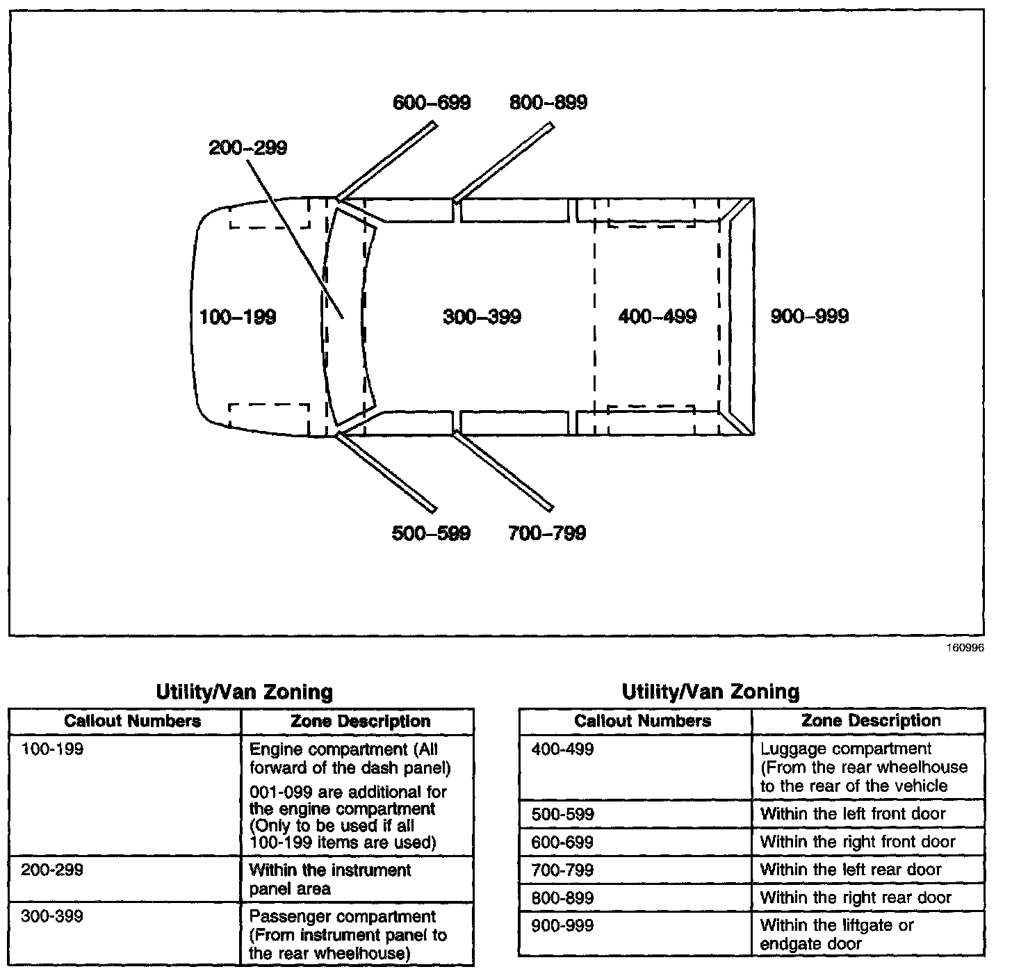 All grounds, in-line connectors, pass-through grommets, and splices have identifying numbers that correspond to where they are located in the vehicle. The table explains the numbering system.
