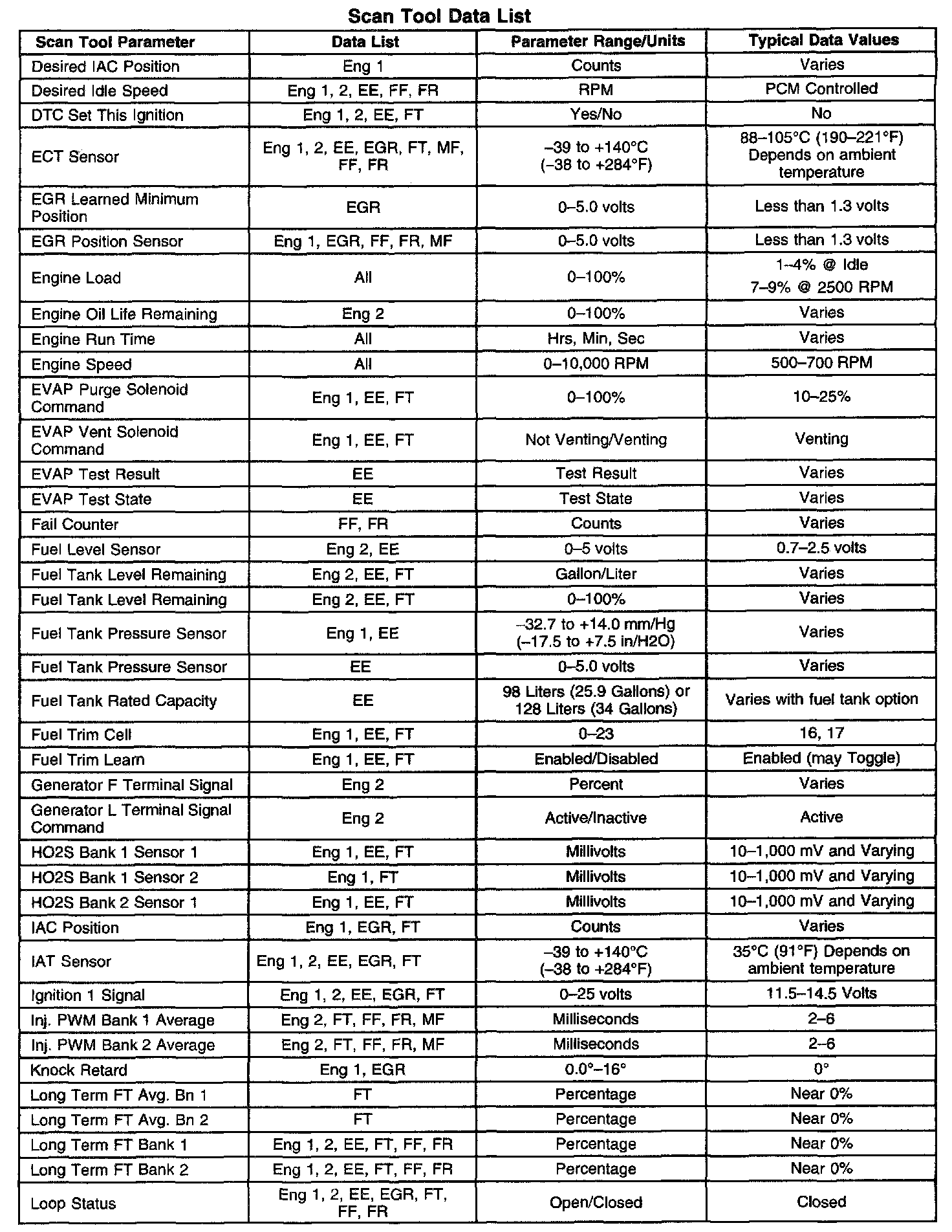 The Engine Scan Tool Data List contains all engine related parameters that are available on the scan tool. The list is arranged in alphabetical order. A given parameter may appear in any one of the data lists, and in some cases may appear more than once, or in more than one data list in order to group certain related parameters together.