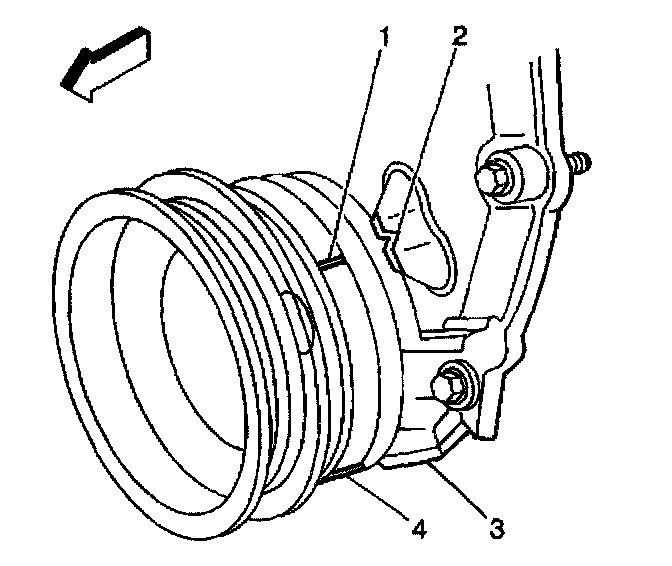 Rotate the crankshaft balancer to position the crankshaft balancer alignment mark (1) 57-63 degrees clockwise or counterclockwise from the engine front cover alignment tab (2).