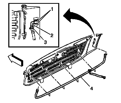 3. Install the headlamp washer supply hose (4) to the grille.