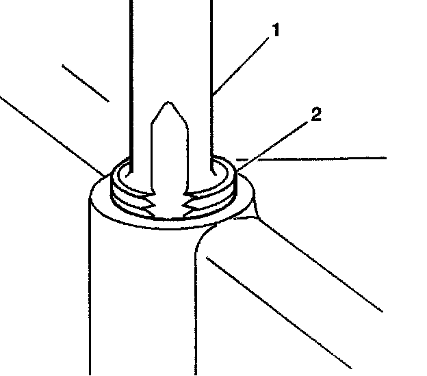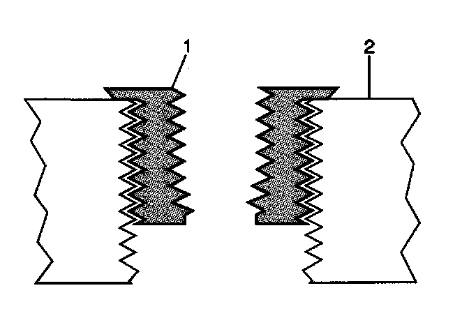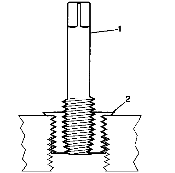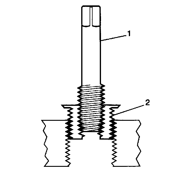 Important: The use of a cutting type fluid GM P/N United States 1052864, GM P/N Canada 992881, WD 40 or equivalent is recommended when performing the drilling, counterboring and tapping procedures. When installed to the proper depth, the flange (1) of the insert will be seated against surface (2) of the base material of the drilled/tapped hole.