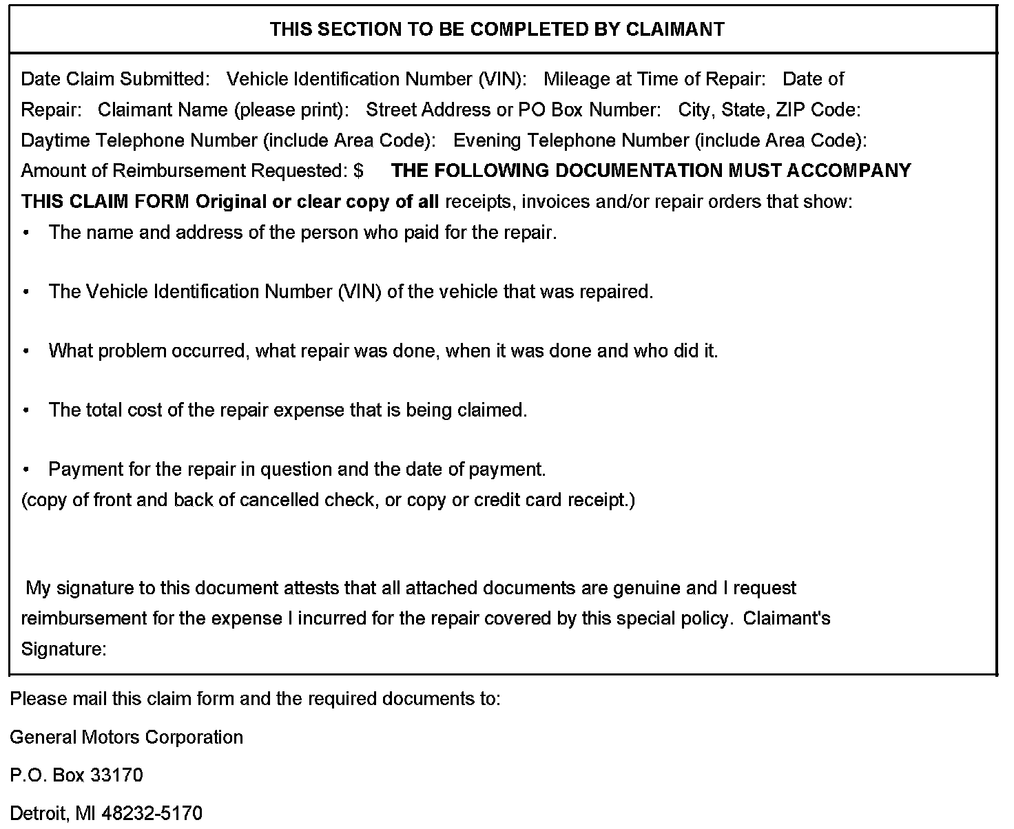 ^ Incomplete, you will receive a letter from General Motors identifying the documentation that is needed to complete the claim and offered the opportunity to resubmit the claim when the missing documentation is available.