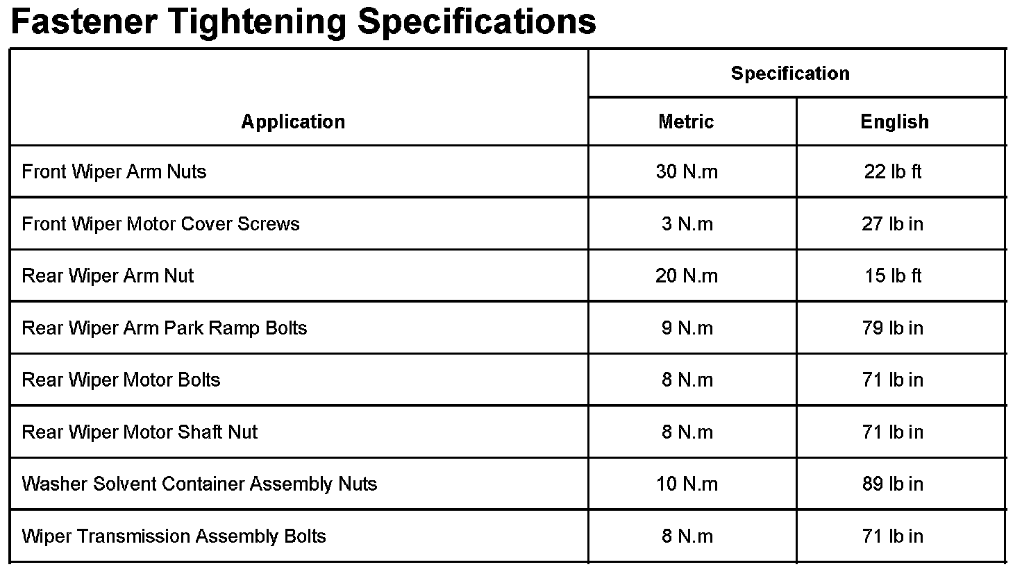 Wiper and Washer Systems: Specifications