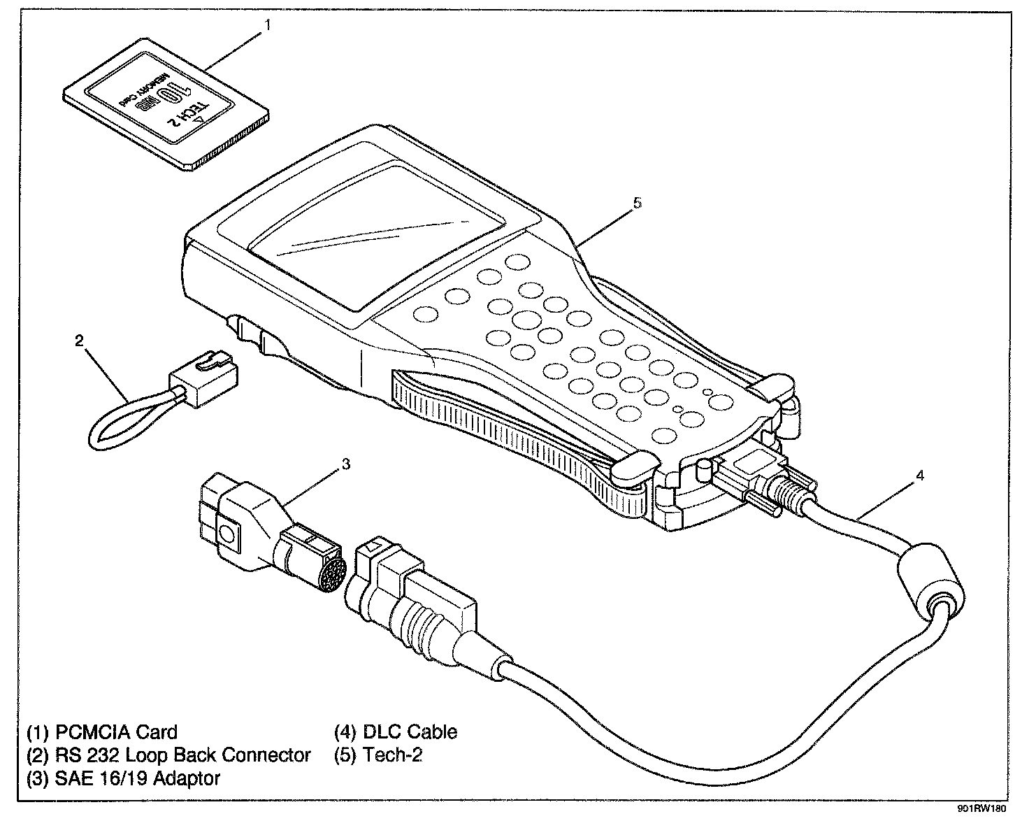 1. The lsuzu 98 System PCMCIA card (1) inserts into the tech 2 (5).