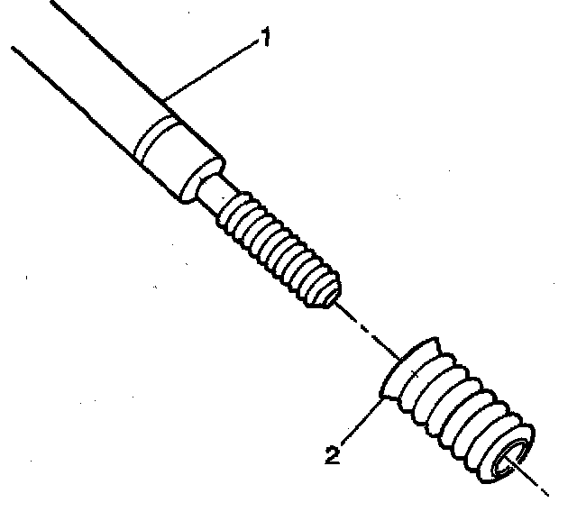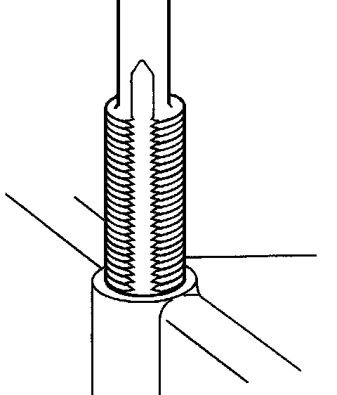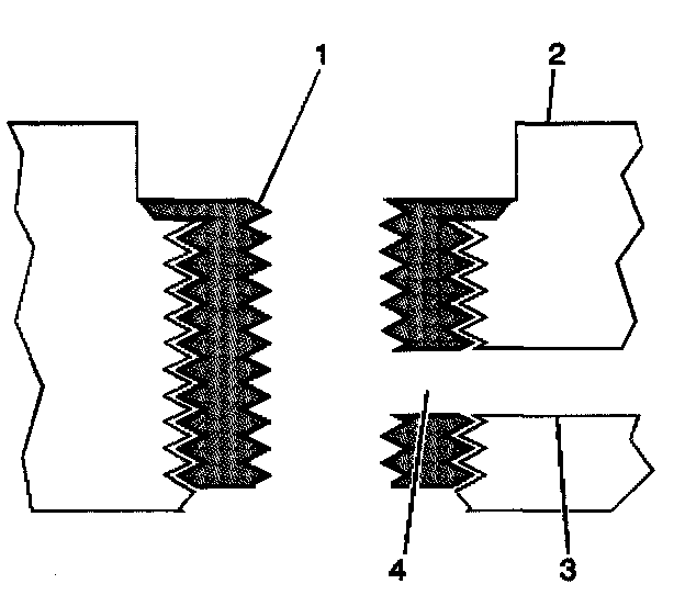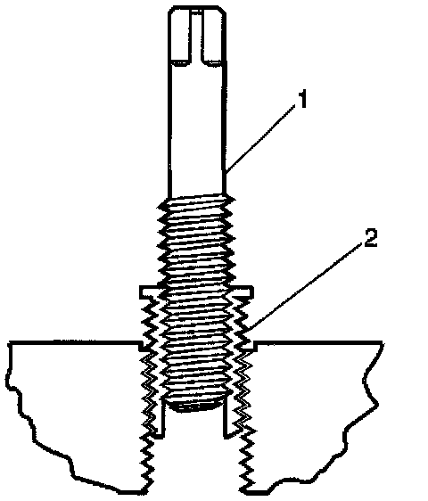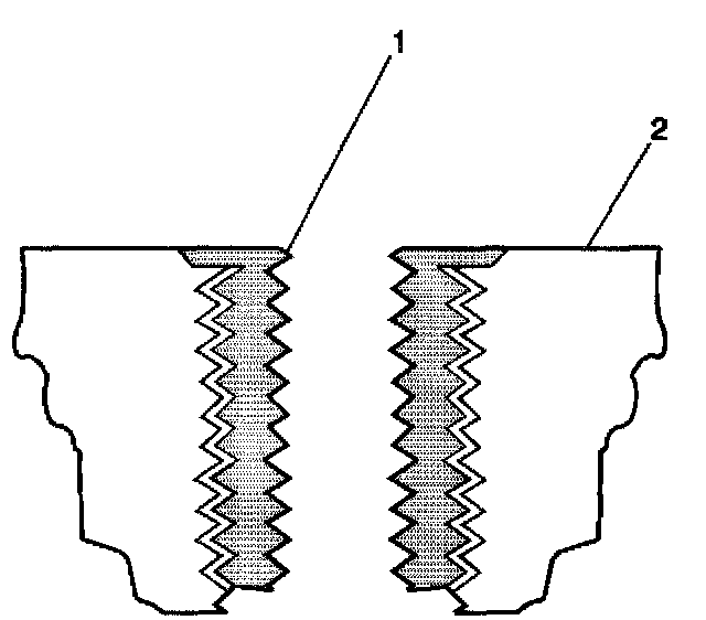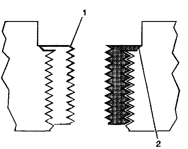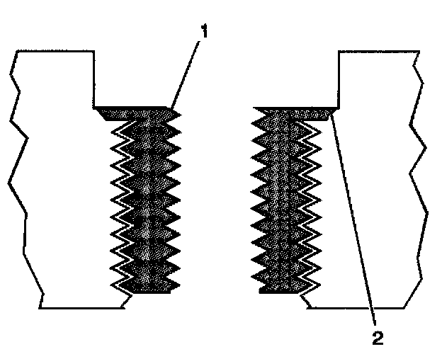 15. Inspect the insert for proper installation into the tapped hole. A properly installed insert (1) will be either flush or slightly below flush with the surface of the base material (2).