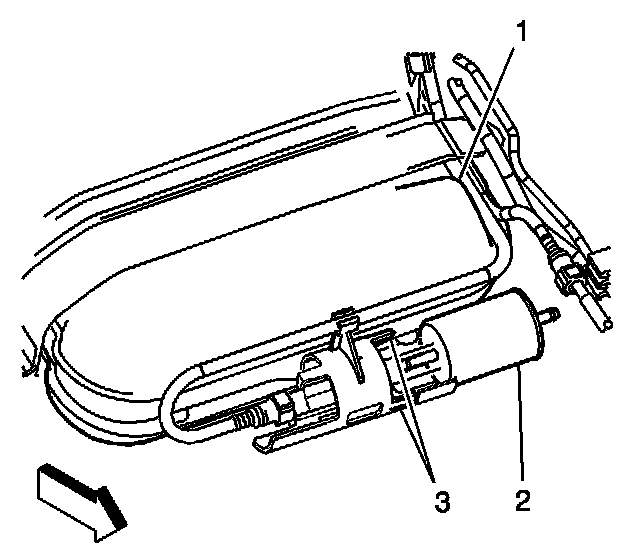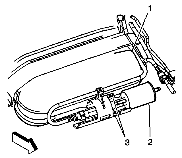 1. Slide the fuel filter (2) into the fuel filter bracket, until the locking tabs (3) are fully engaged.