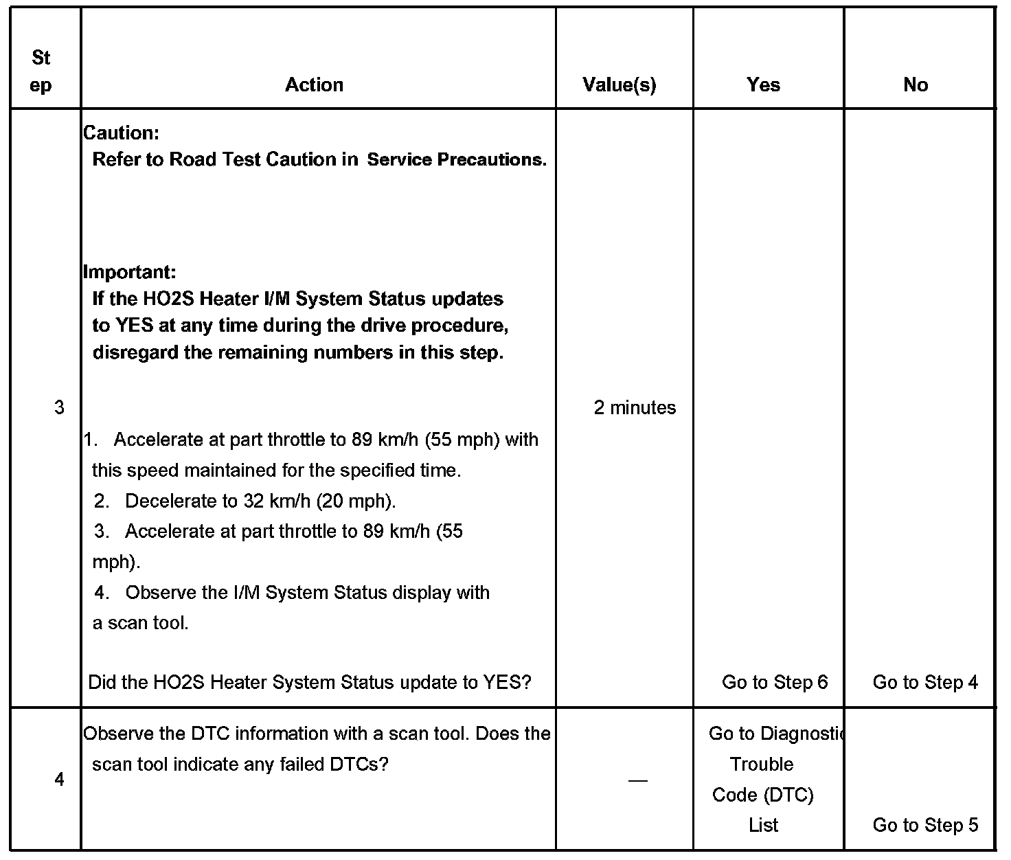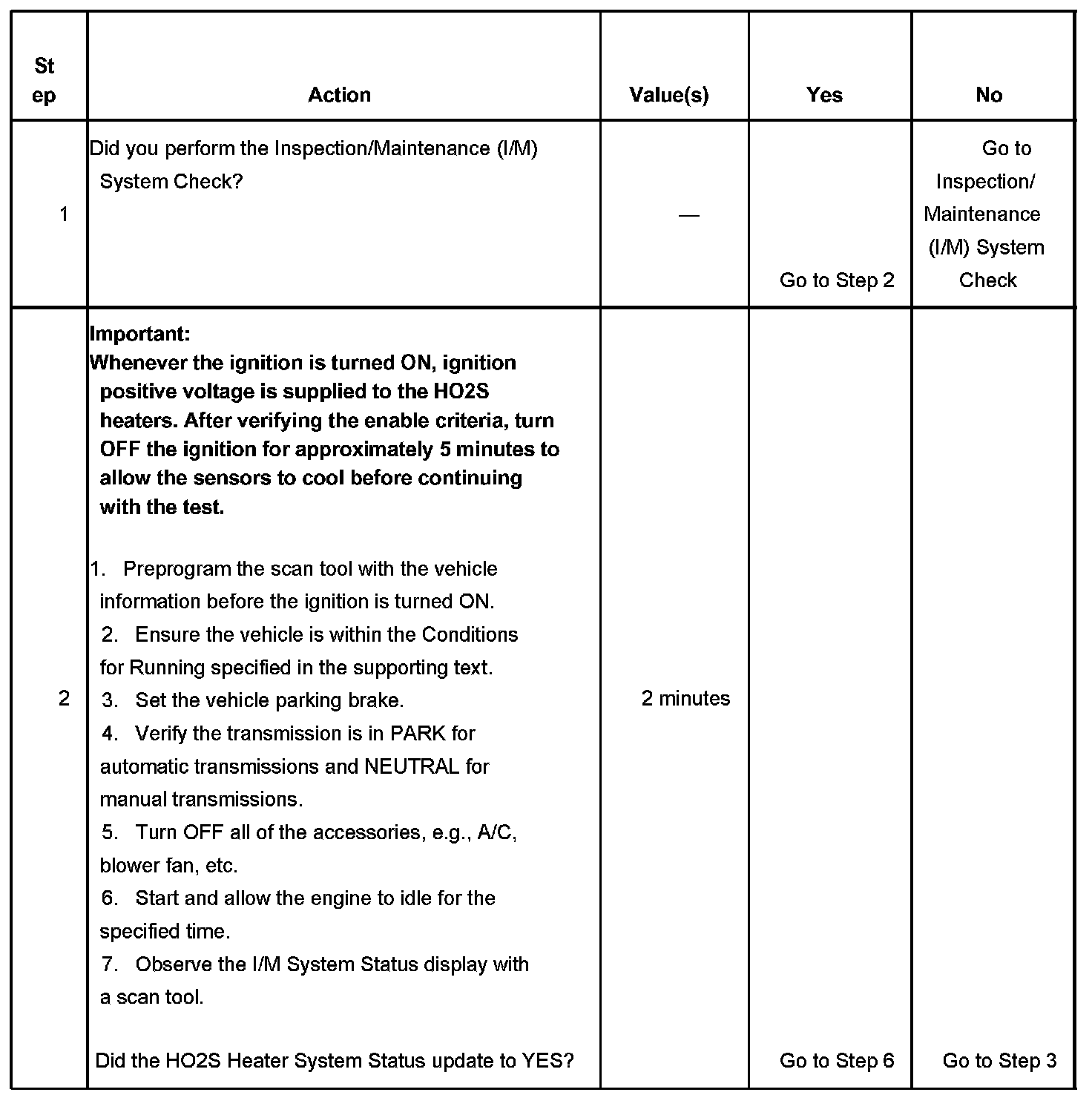 The purpose of this procedure is to satisfy the enable criteria necessary to execute inspection/maintenance (I/M) system monitor for the Heated Oxygen Sensor (HO2S) System. The system monitor is comprised of the test results from one or more DTCs. The procedure may be used to set the HO2S Heater I/M System Status display on the scan tool to YES. The HO2S Heater I/M System Status display indicates whether or not the control module has completed the system monitor. The system monitor completes when either all DTCs comprising the monitor run and pass, or any DTC comprising the monitor illuminates the malfunction indicator lamp (MIL). If one of the DTCs comprising the monitor is set and the MIL is not illuminated, the necessary trips are required to illuminate the MIL before the monitor will complete. Once the monitor completes, the HO2S Heater I/M System Status display will be updated to YES.