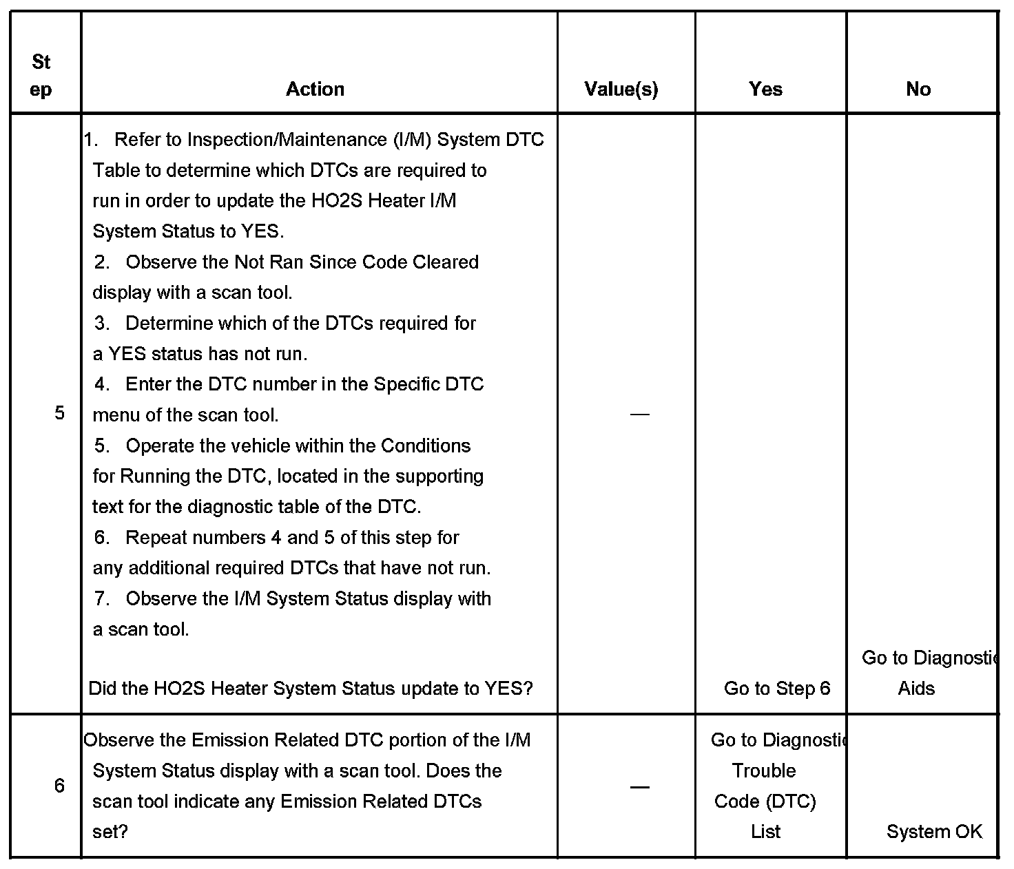 If there is an impending failure, the system may require more time than was allotted in the system set procedure. If any DTCs do not run and no DTC is set, review the appropriate scan tool data list and service information. This will give an indication of why the DTCs do not run. Some may abort due to changes in the conditions while running. For example, changes in engine load such as a cooling fan or air conditioning (A/C) compressor clutch turning ON, may cause a DTC to abort. If the HO2S Heater I/M System Status does not update to YES, the procedure can be repeated until a YES status is achieved.