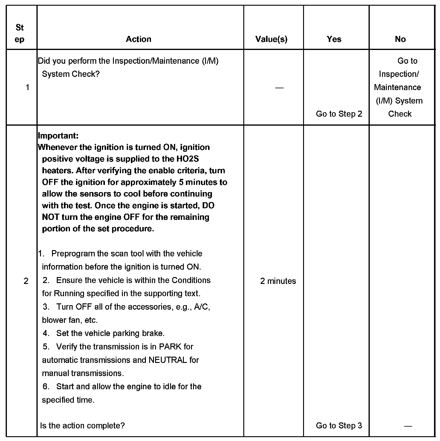 The purpose of the inspection/maintenance (I/M) Complete System Set Procedure is to satisfy the enable criteria necessary to execute all of the I/M readiness diagnostics, and complete the trips for those particular diagnostics. When all diagnostic tests are completed, the I/M System Status indicators are set to YES. Perform this procedure when more than one of the I/M System Status indicators are set to NO.