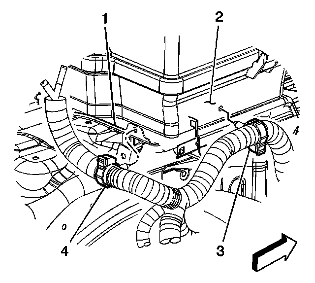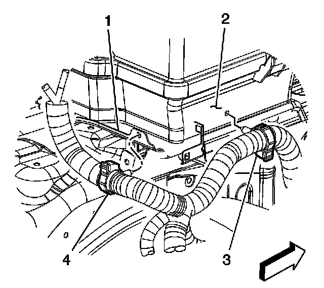3. Open the battery cable harness retainer (4) at the battery tray (1).