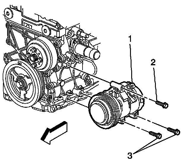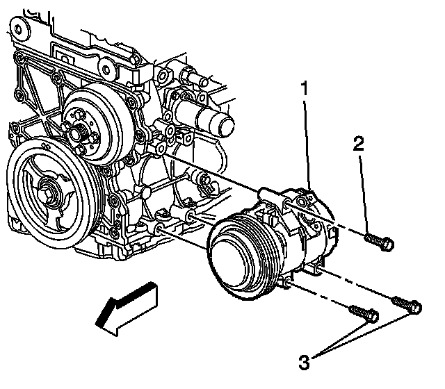 7. Remove the A/C compressor mounting bolts (2, 3) ONLY. The upper mounting bolt (2) will remain with the A/C compressor (1).