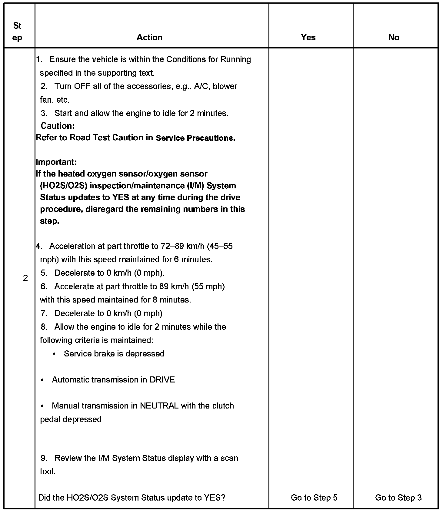 The purpose of this procedure is to satisfy the enable criteria necessary to execute inspection/maintenance (I/M) readiness diagnostics for the Heated Oxygen Sensor/Oxygen Sensor (HO2S/O2S) System. This procedure may be used to set the HO2S/O2S I/M System Status display on the scan tool to YES. The HO2S/O2S I/M System Status display indicates whether or not the control module has completed the readiness diagnostics. The readiness diagnostics complete when all DTCs comprising the diagnostics run and pass, or any DTC comprising the diagnostics illuminates the malfunction indicator lamp (MIL). Once the diagnostics complete, the HO2S/O2S I/m System Status display will be updated to YES.