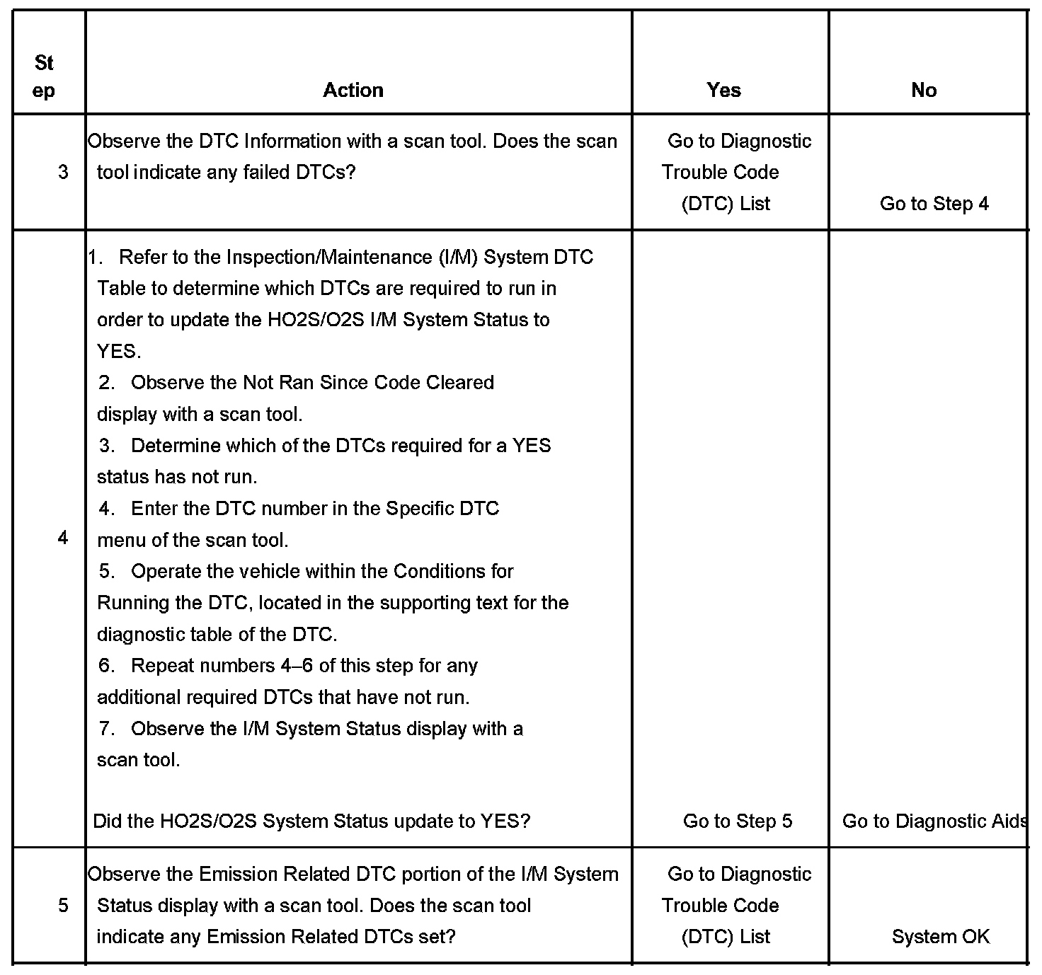 If there is an impending failure, the system may require more time to run the diagnostics than was allotted in the system set procedure. If any DTCs do not run and no DTC is set, review the appropriate scan tool data list and service information. This will give an indication of why the DTCs do not run. Some diagnostics may abort due to changes in the conditions while the diagnostics are running. For example, changes in engine load such as a cooling fan or A/C compressor clutch turning ON, may cause the diagnostics to abort. If the HO2S/O2S I/M System Status does not update to YES, the procedure can be repeated until a YES status is achieved.