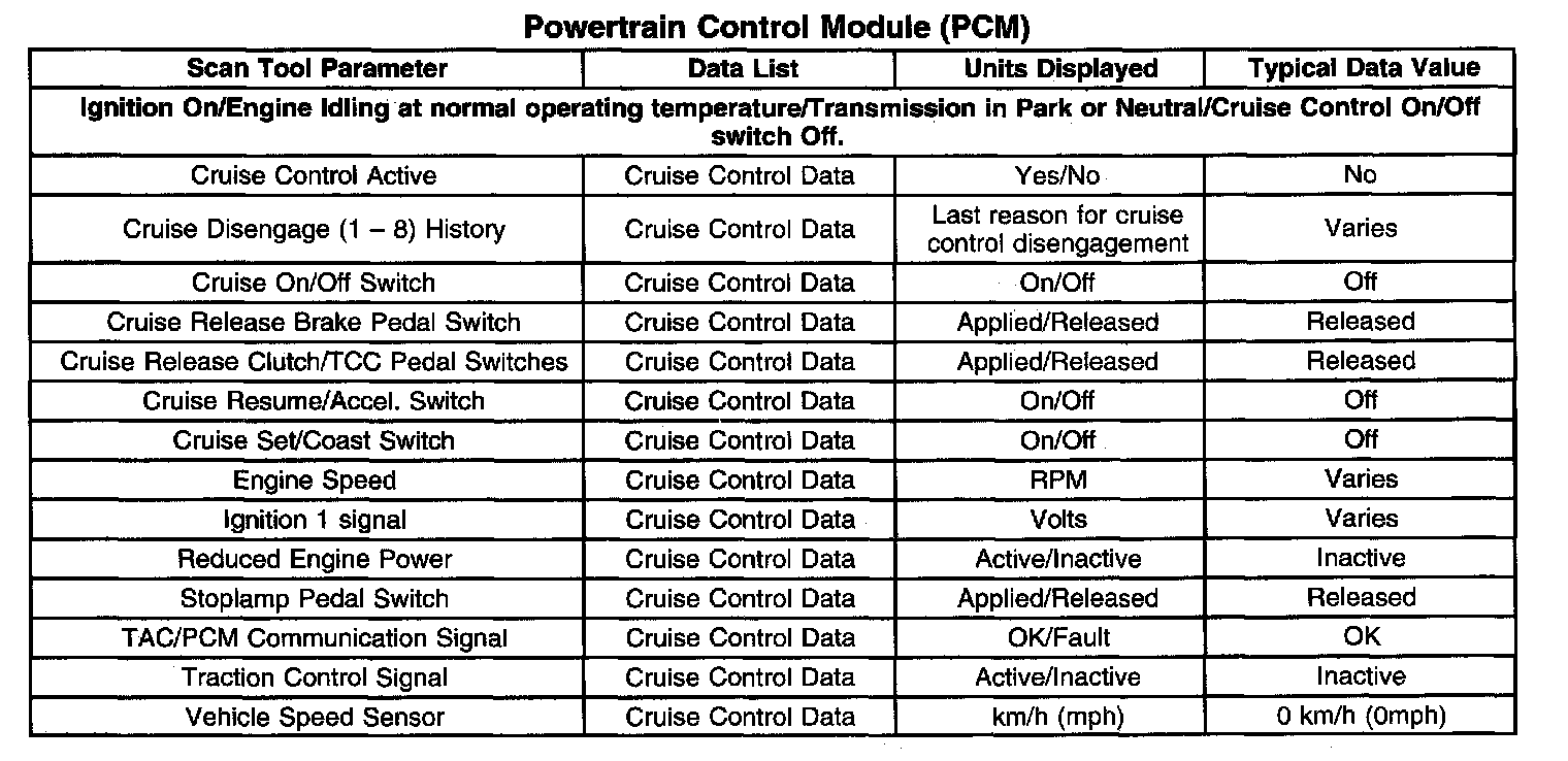 Powertrain Control Module (PCM) Scan Tool Data List: