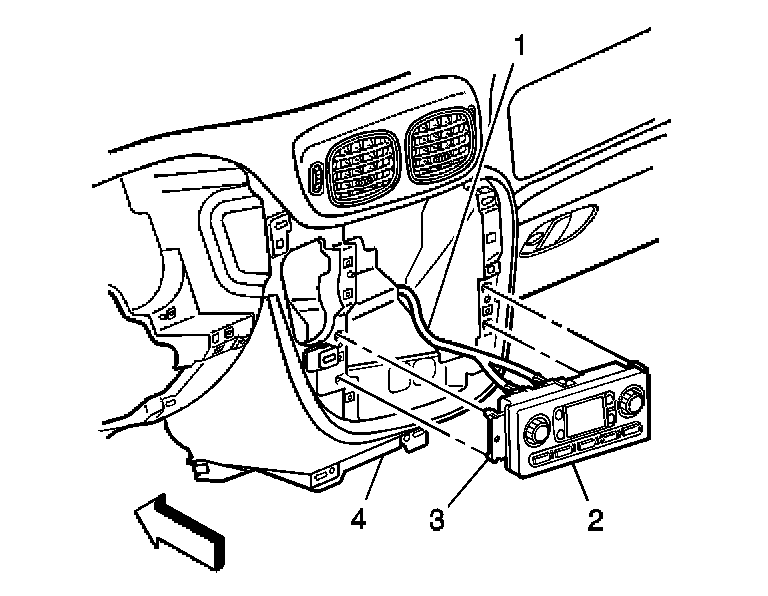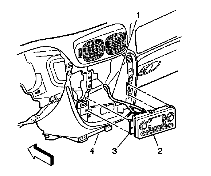 3. Depress the HVAC control module tabs (3) and remove the HVAC control module (2) from the IP (4).