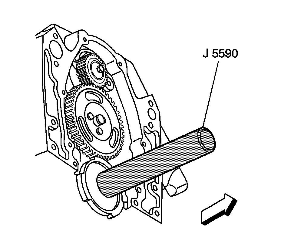 2. Using J 5590, push the CKP sensor reluctor ring onto the crankshaft until completely seated against the crankshaft sprocket.
