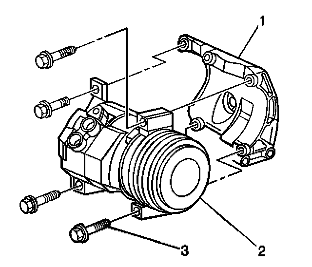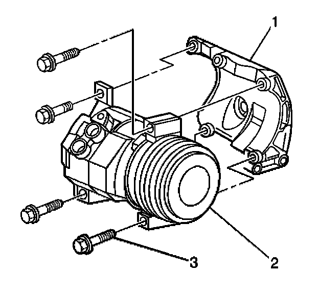 1. Install the A/C compressor (2) to the A/C bracket (1).