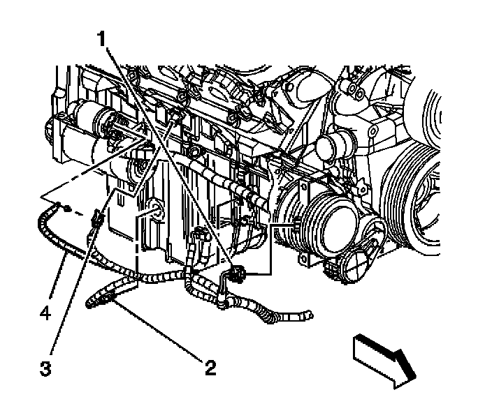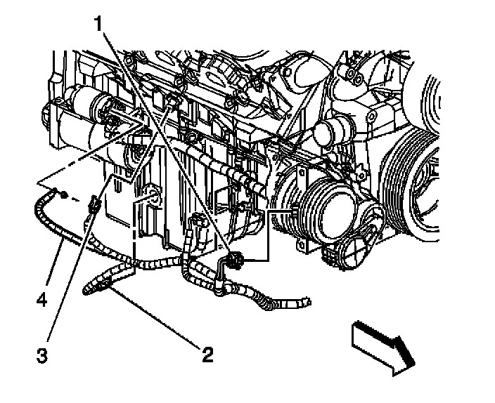 6. Remove the engine harness ground (4) from the starter solenoid.