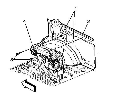 2. Install the two bolts (3) inside the vehicle in order to retain the auxiliary HVAC module to the vehicle.