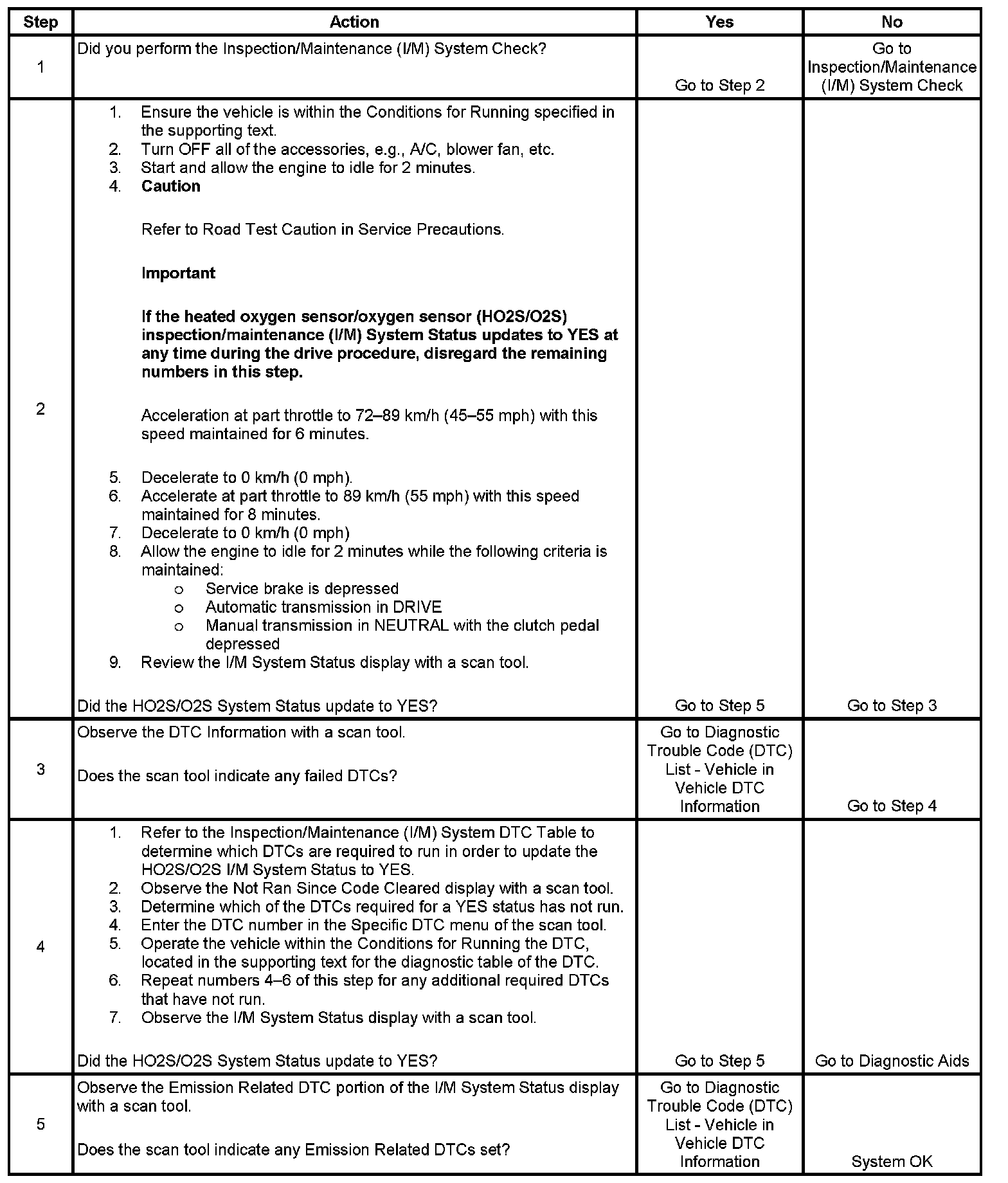 The purpose of this procedure is to satisfy the enable criteria necessary to execute inspection/maintenance (I/M) readiness diagnostics for the Heated Oxygen Sensor/Oxygen Sensor (HO2S/O2S) System. This procedure may be used to set the HO2S/O2S I/M System Status display on the scan tool to YES. The HO2S/O2S I/M System Status display indicates whether or not the control module has completed the readiness diagnostics. The readiness diagnostics complete when all DTCs comprising the diagnostics run and pass, or any DTC comprising the diagnostics illuminates the malfunction indicator lamp (MIL). Once the diagnostics complete, the HO2S/O2S I/m System Status display will be updated to YES.