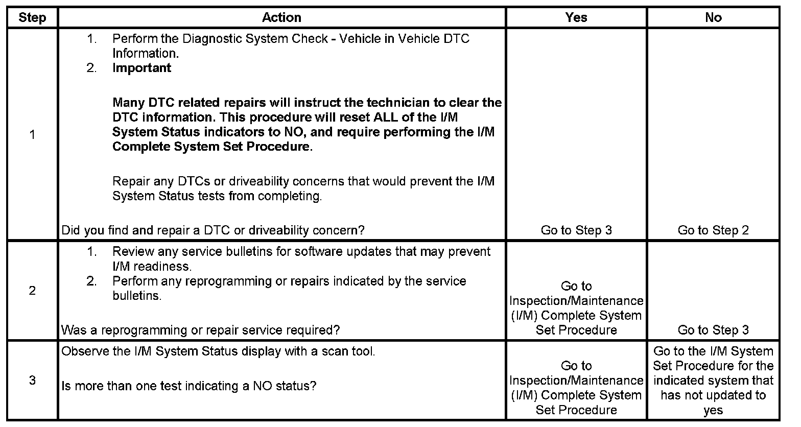 For the specific DTCs required for each system, refer to Inspection/Maintenance (I/M) System DTC Table. Systems such as fuel delivery, misfire, and comprehensive components may not be listed in a system status list. These tests run continuously and do not require an I/M System Status indicator. Inspection/Maitenance (I/M) System (DTC) Table